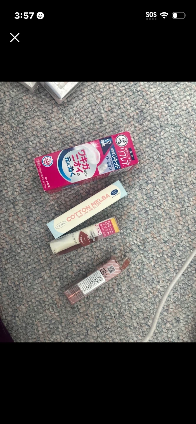This bundle includes a Romand Cotton Melba Dewy-Ful Water Tint and a Relifia Liquid Roll-On Deodorant for underarm odour. The tint offers long-lasting colour, while the deodorant is formulated with antibacterial properties. Both are Japanese and Korean beauty products. Pick up cash only