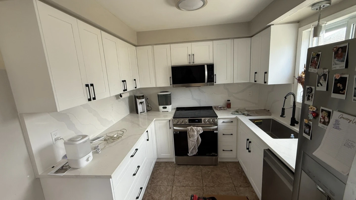 white kitchen cabinets and matching quartz countertops. Includes sink and faucet.. This modern kitchen layout is bright and spacious. Designed for efficient workflow and ample storage. It's ready to transform your kitchen space as per your layout.