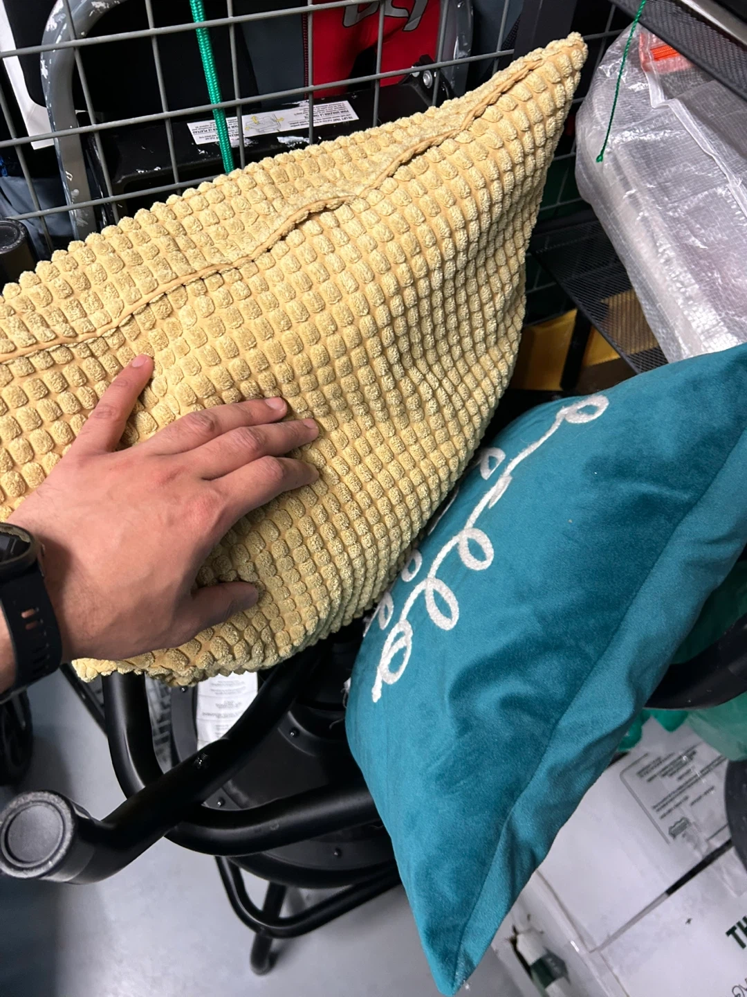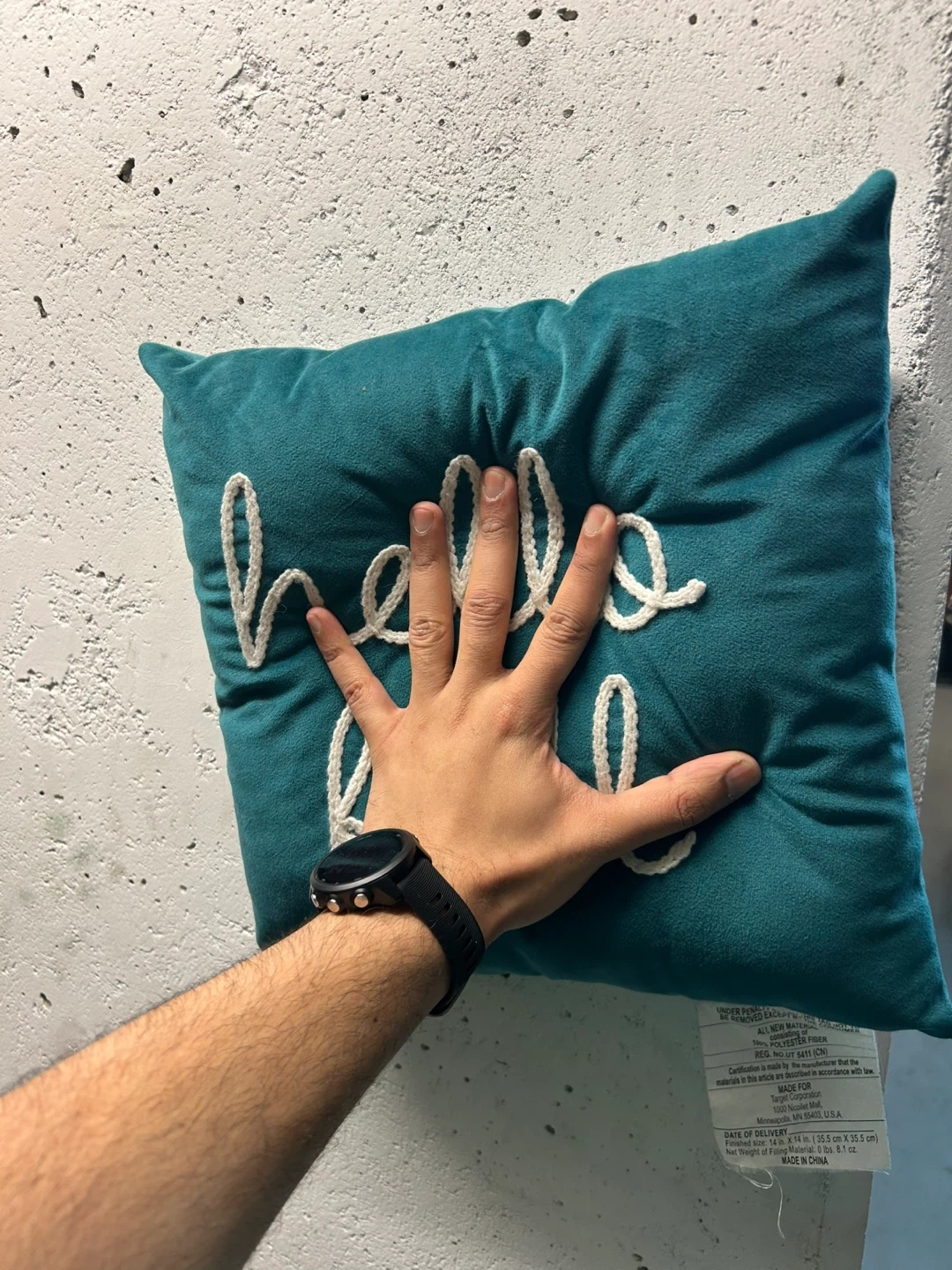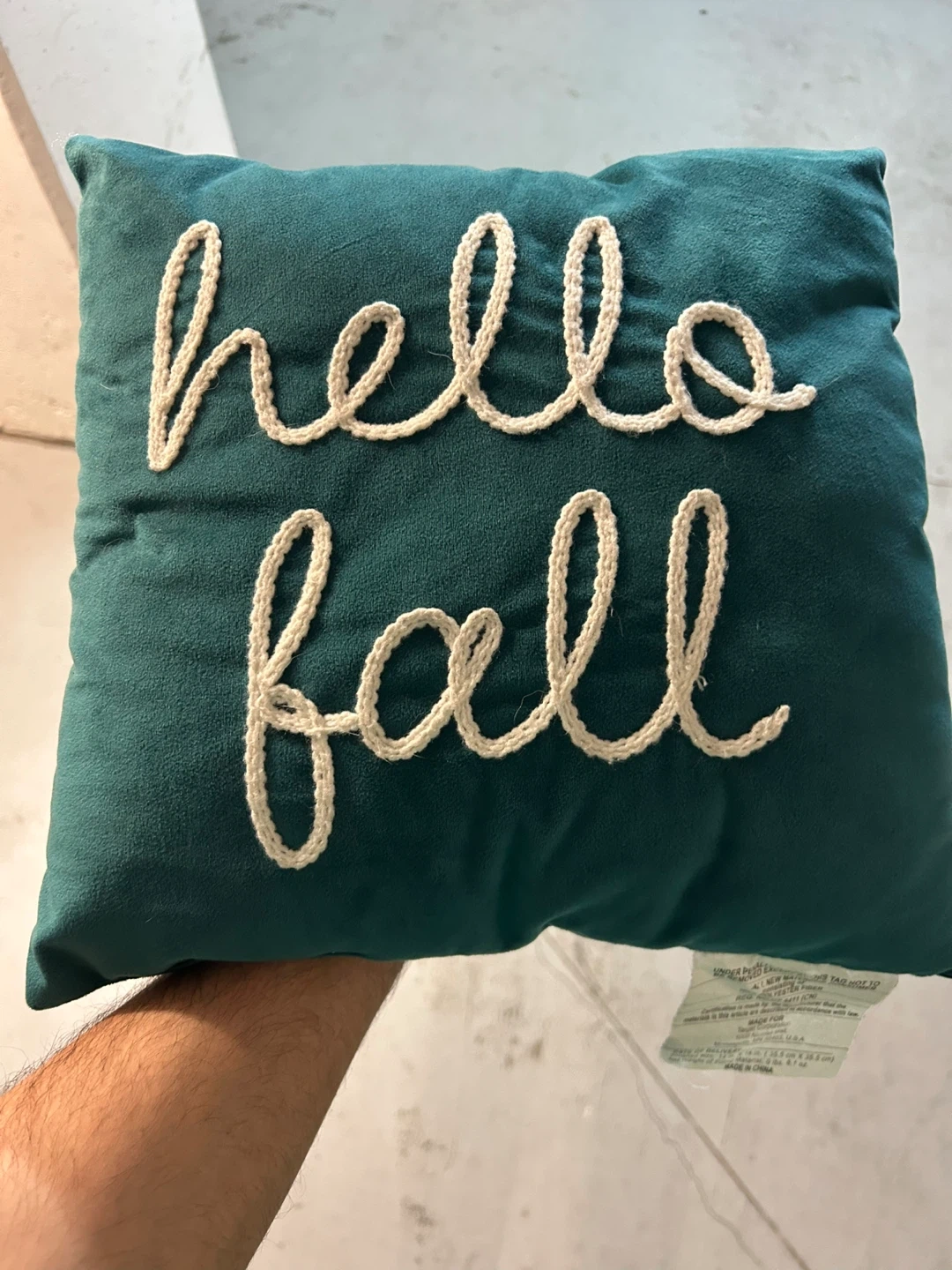 This teal throw pillow features the phrase "hello fall" stitched in white cord. It's made with a soft polyester cover and fill. Perfect for adding a seasonal touch to your couch or chair! $10 for each, $15 for both