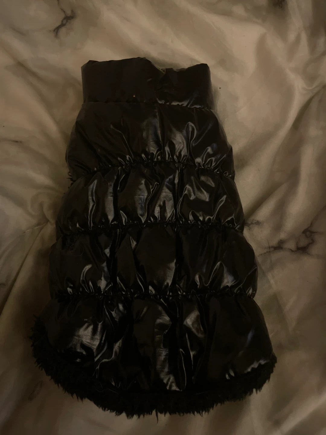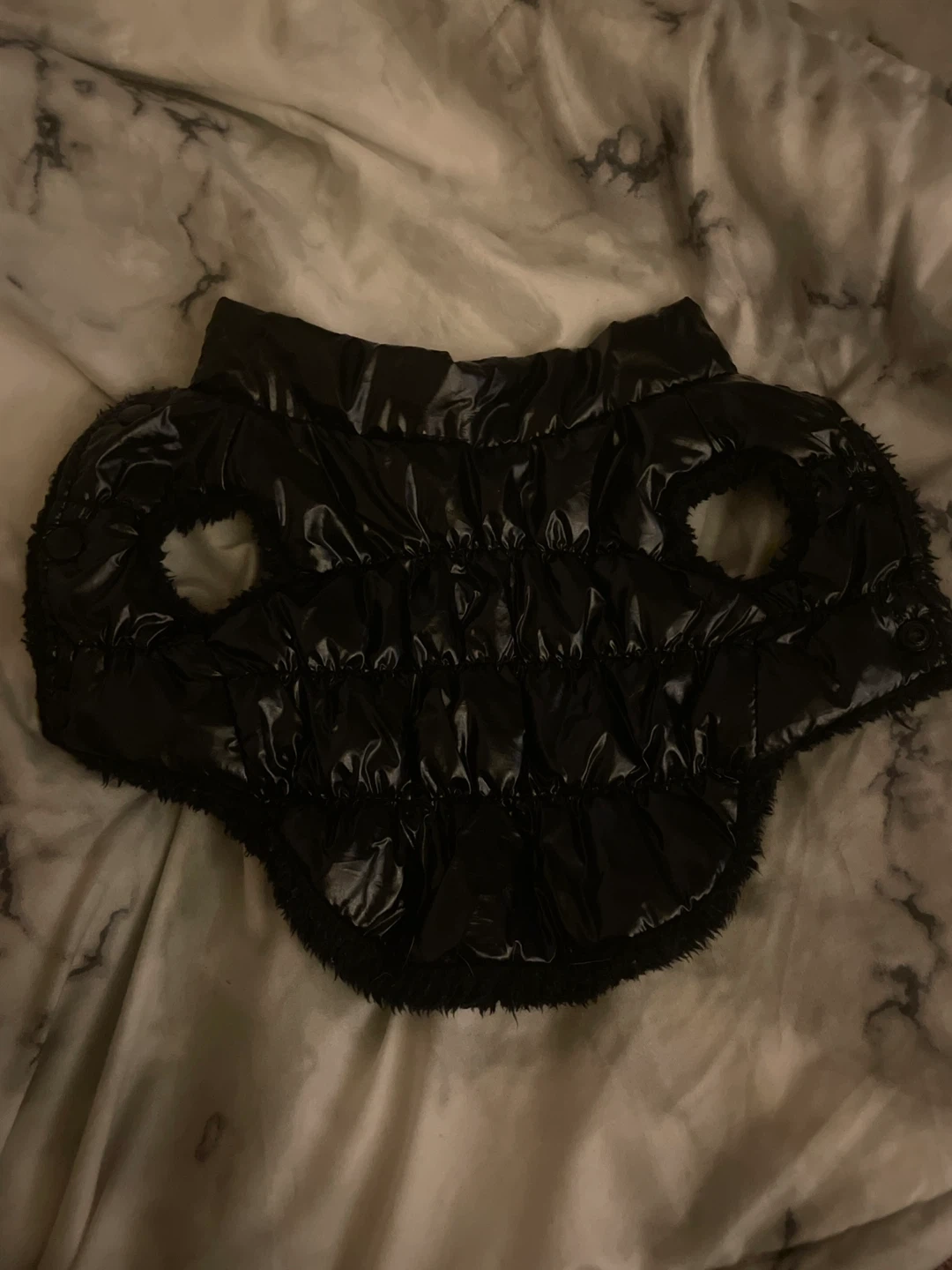 This black puffer vest for dogs features a shiny outer shell and a soft, furry lining. It has button closures down the front and cutouts for the legs. Size XS