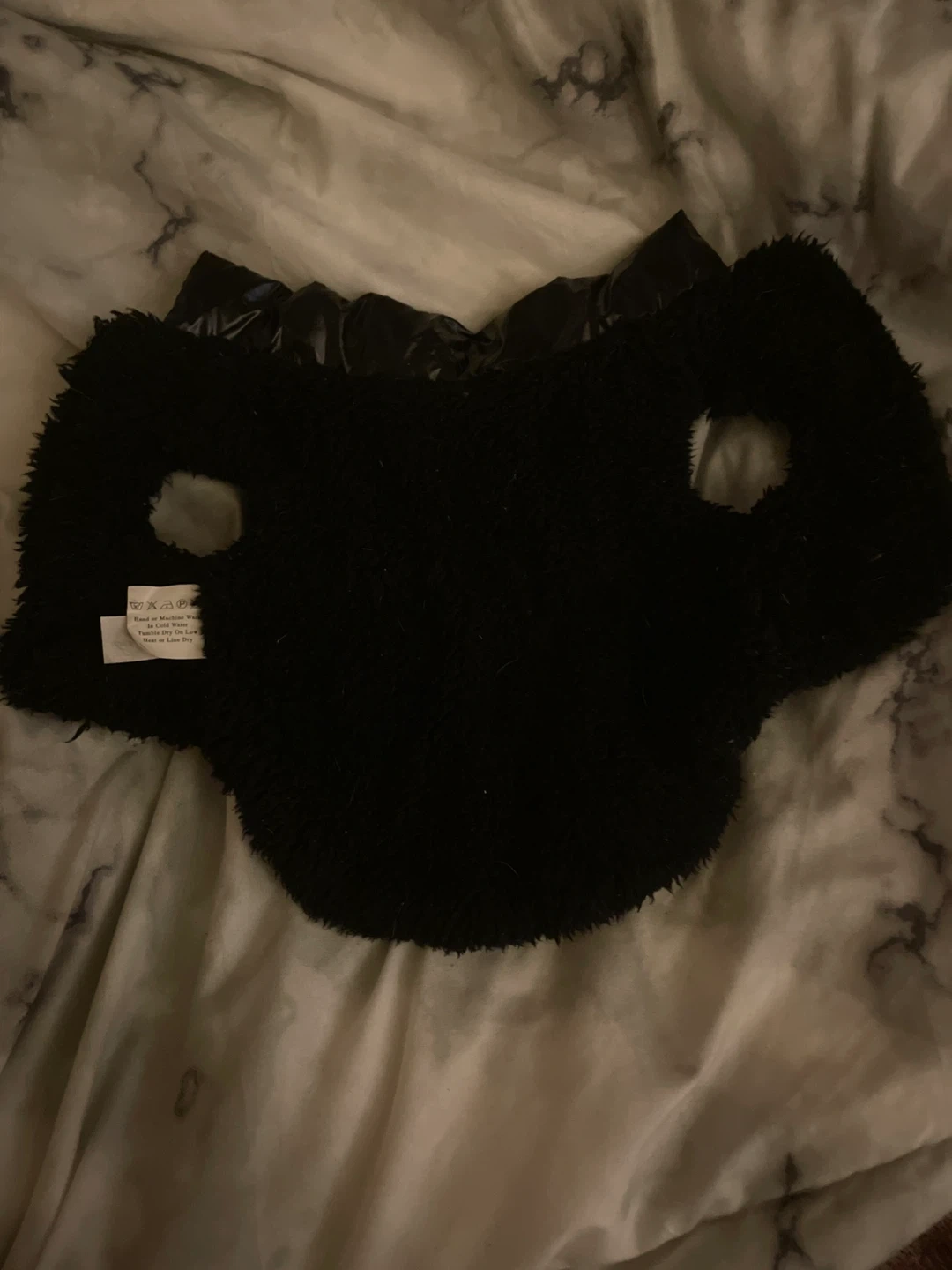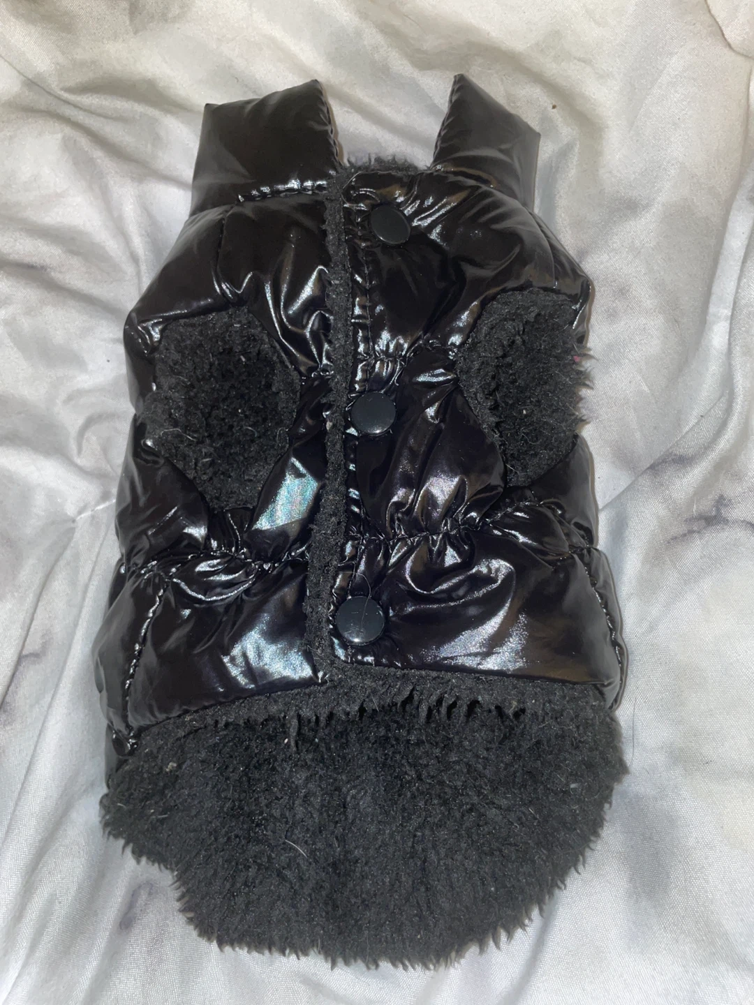 This black puffer vest for dogs features a shiny outer shell and a soft, furry lining. It has button closures down the front and cutouts for the legs. Size XS