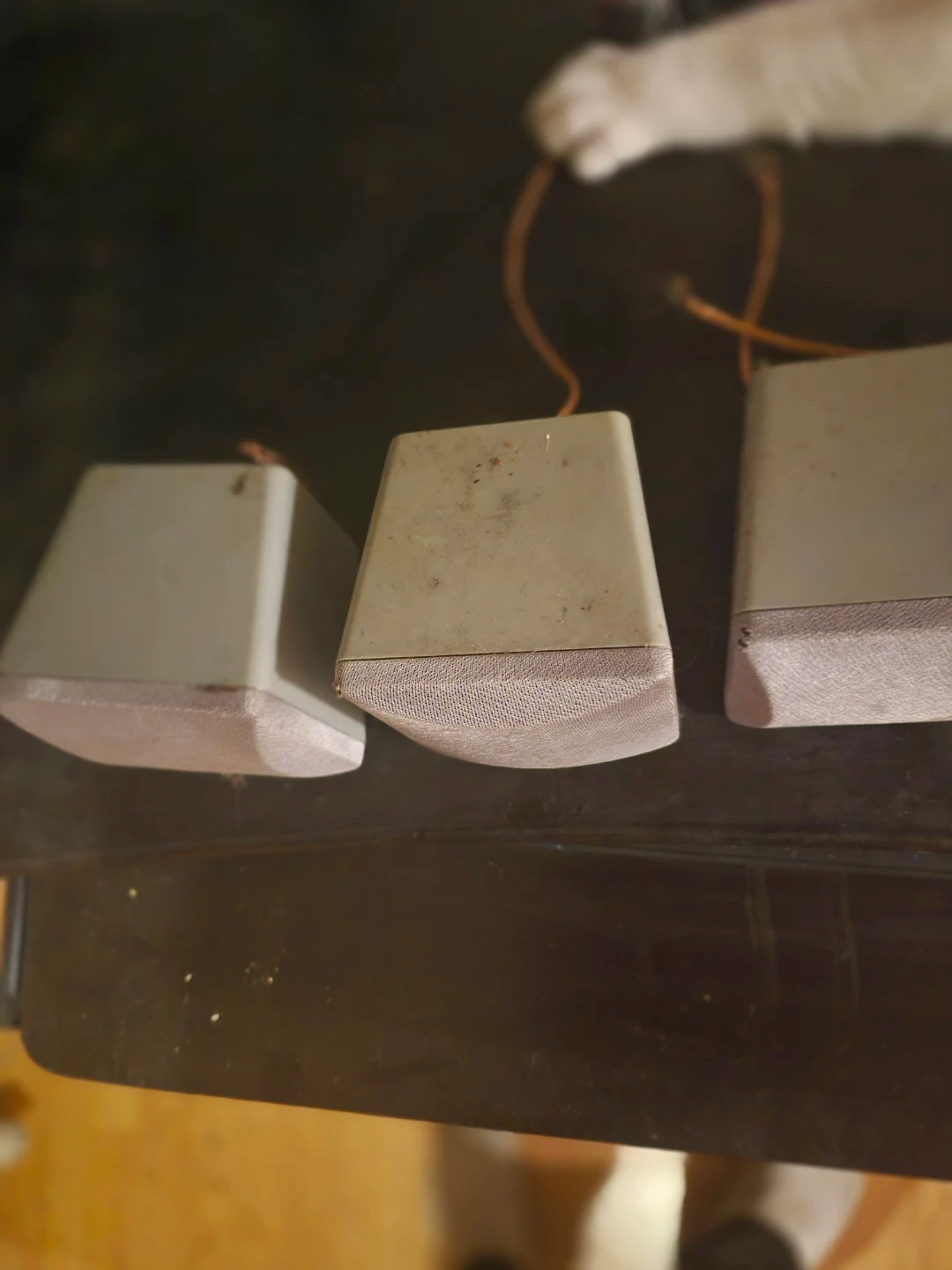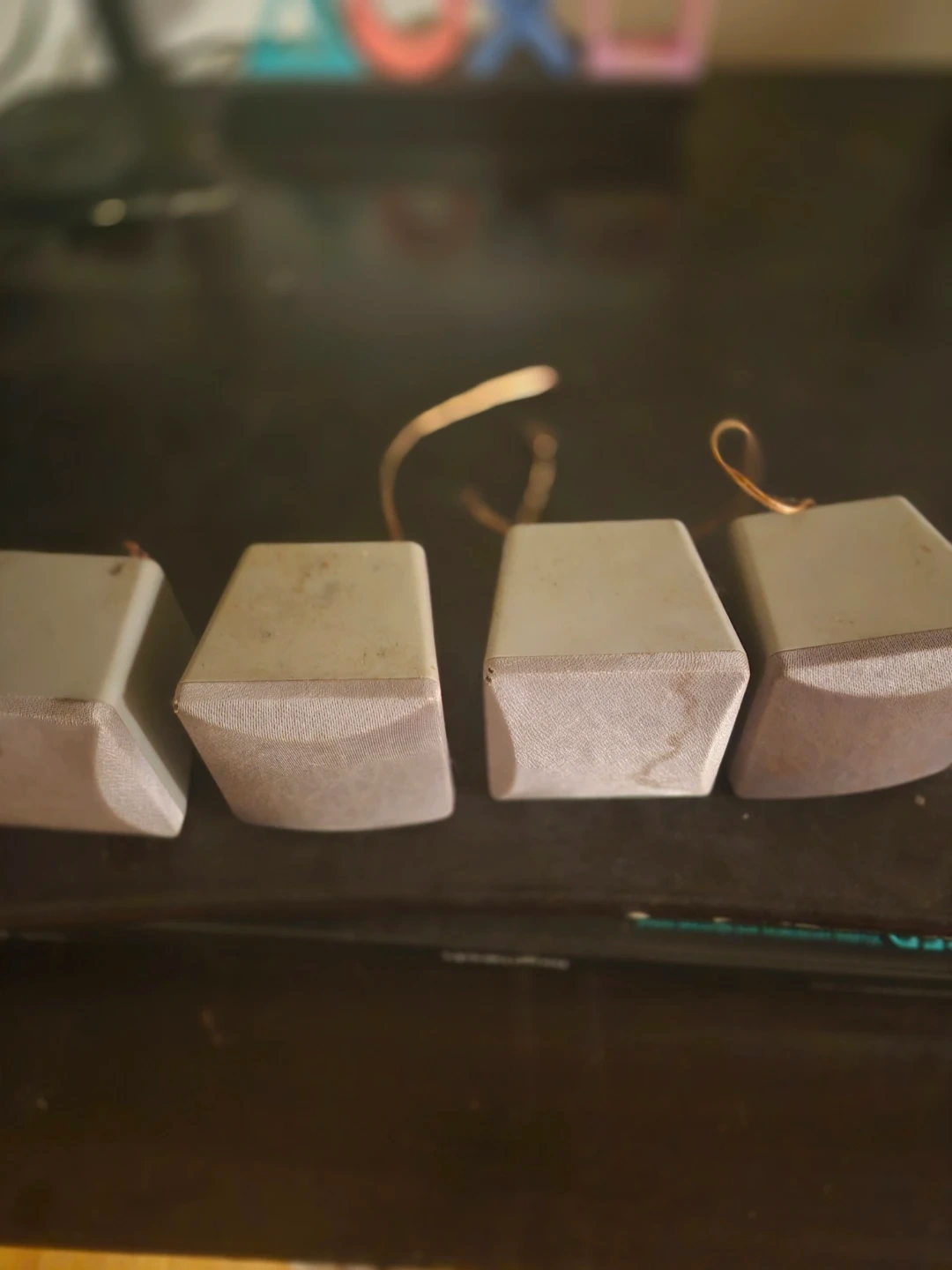 These are four satellite speakers for a home theatre system. They're a light grey colour with a fabric speaker grill. Each speaker has an orange wire for connecting. Small cube shape.