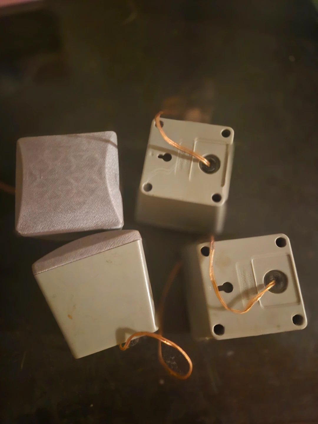 These are four satellite speakers for a home theatre system. They're a light grey colour with a fabric speaker grill. Each speaker has an orange wire for connecting. Small cube shape.