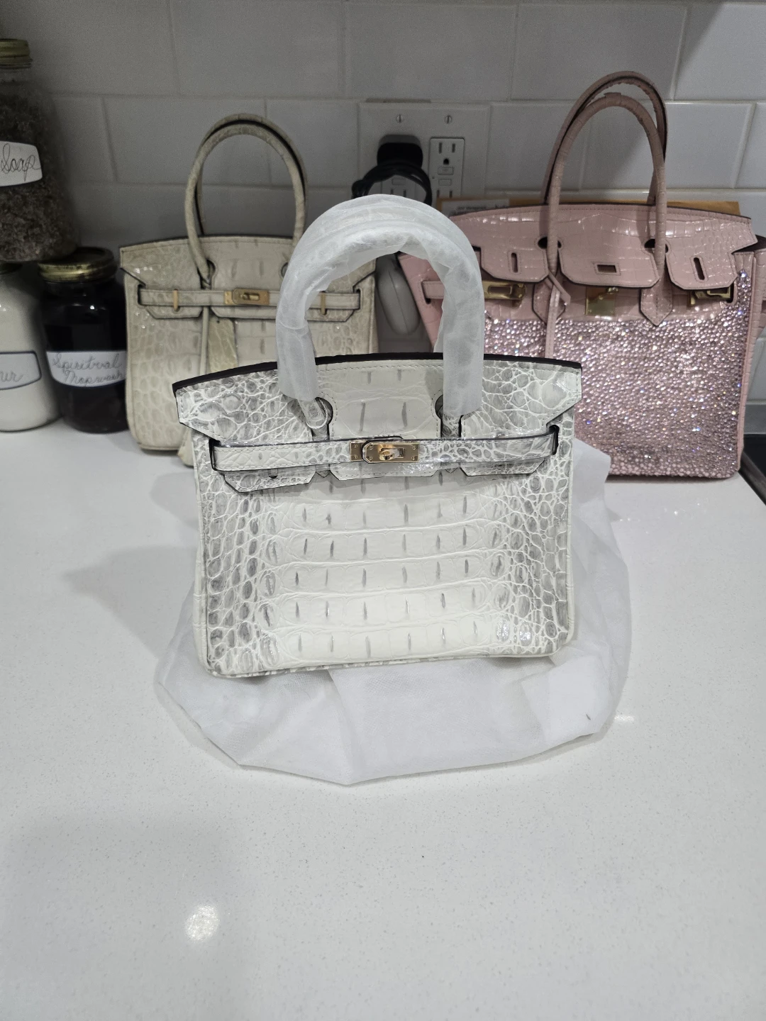 This white handbag features a crocodile embossed texture. It's designed with a top handle and gold-tone hardware. The bag includes protective plastic on the handle.Firm on price and will not accept lowballs.