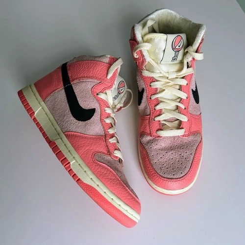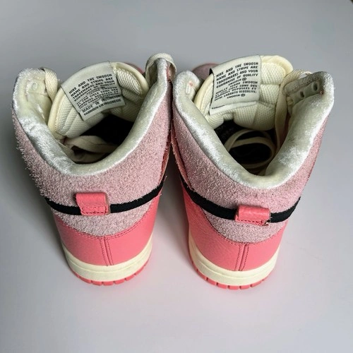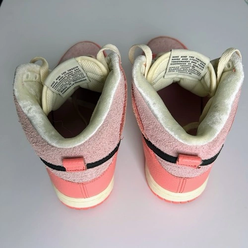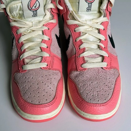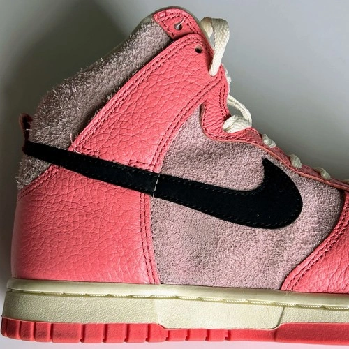 Nike Dunk Highs from the 2022 "Hoops Pack." This colourway features a mix of Medium Soft Pink and Black accents, on a Coconut Milk midsole. Excellent preowned condition with little to no visible wear. No original box, will be securely packaged in a replacement box. Features "hairy suede" pink base panels with smooth leather overlays. Includes the signature peace-sign basketball logo on the tongue tag and custom insoles. The pink and black contrast makes these perfect for streetwear, Y2K, or casual outfits.
