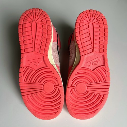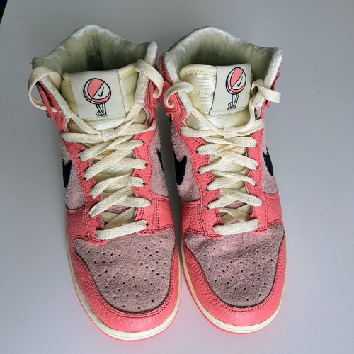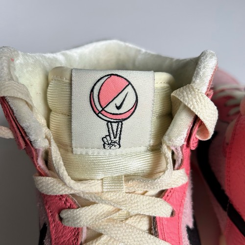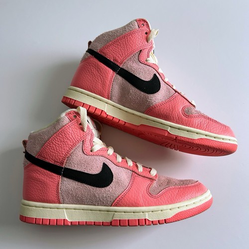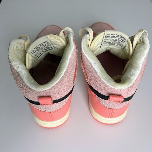 Nike Dunk Highs from the 2022 "Hoops Pack." This colourway features a mix of Medium Soft Pink and Black accents, on a Coconut Milk midsole. Excellent preowned condition with little to no visible wear. No original box, will be securely packaged in a replacement box. Features "hairy suede" pink base panels with smooth leather overlays. Includes the signature peace-sign basketball logo on the tongue tag and custom insoles. The pink and black contrast makes these perfect for streetwear, Y2K, or casual outfits.