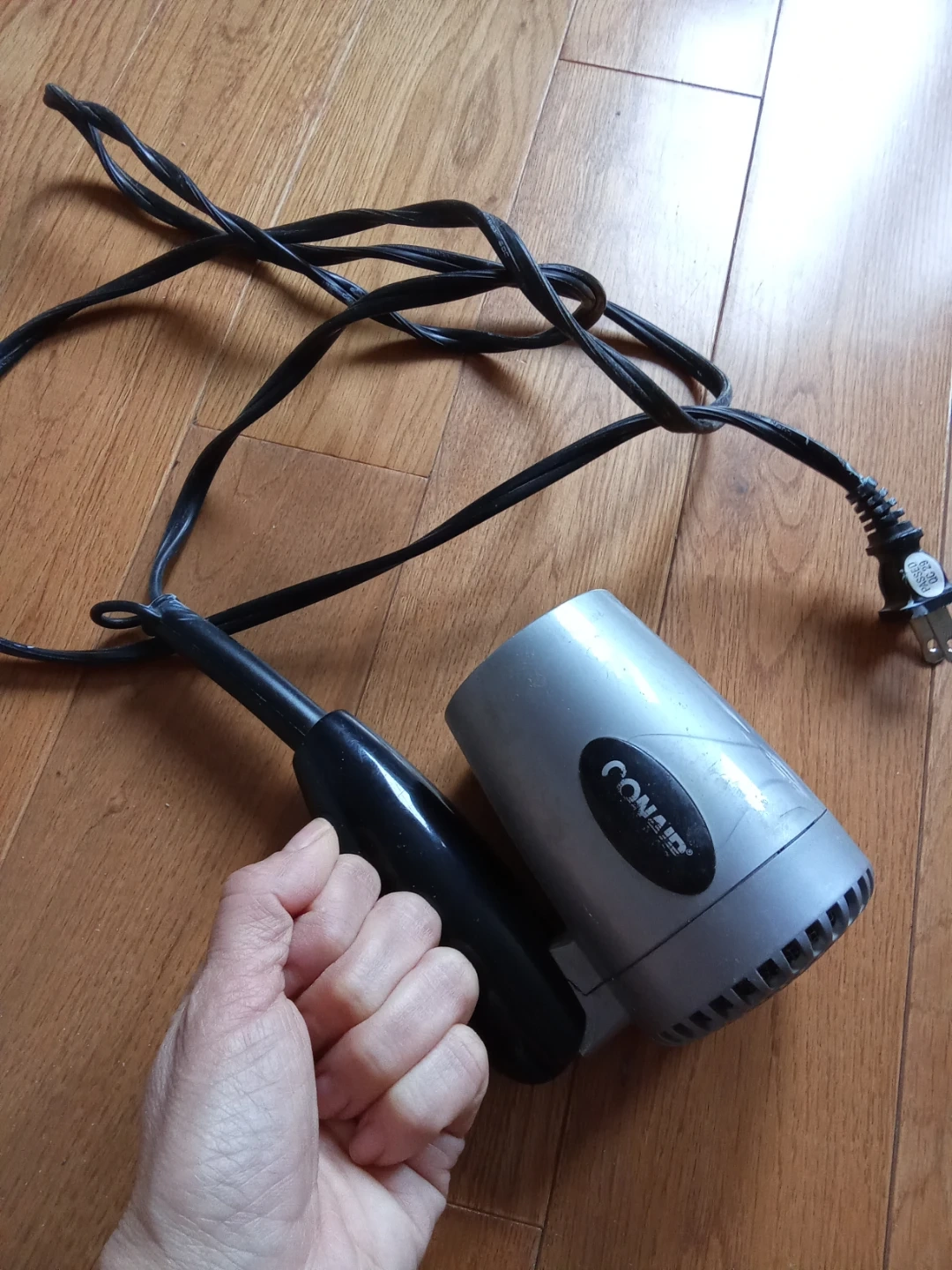 This is a Conair compact hair dryer. It's silver and black with a black cord. This dryer is lightweight and easy to pack for travel. Great for quick touch-ups at home or on the go!