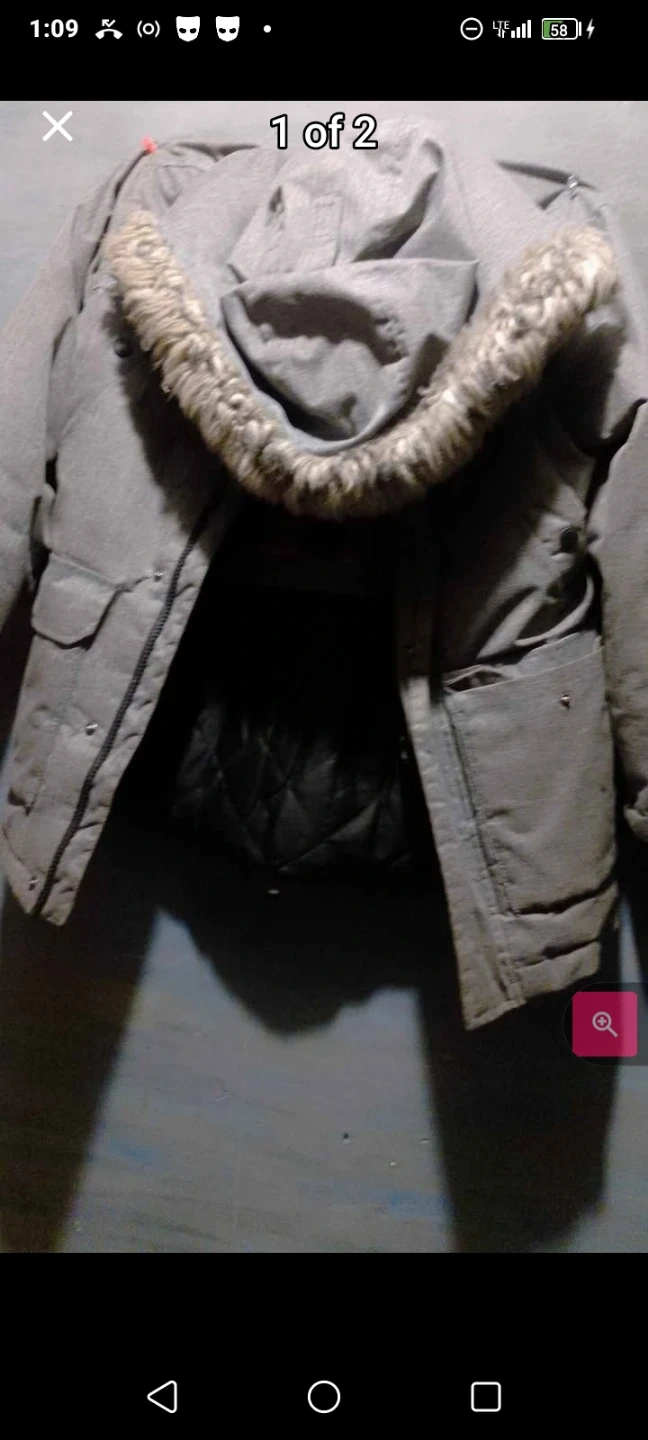 This is a men's grey winter parka jacket. It features a faux fur-lined hood and quilted interior lining. The jacket has multiple front pockets.
