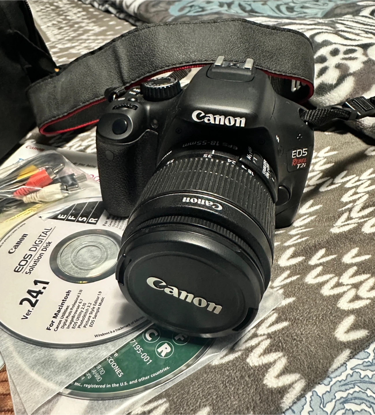 Mint condition. Selling a Canon EOS Rebel T2i DSLR camera. It comes with the EF-S 18-55mm kit lens. Includes the original box, manual, software CDs, battery, charger, and a carrying bag.