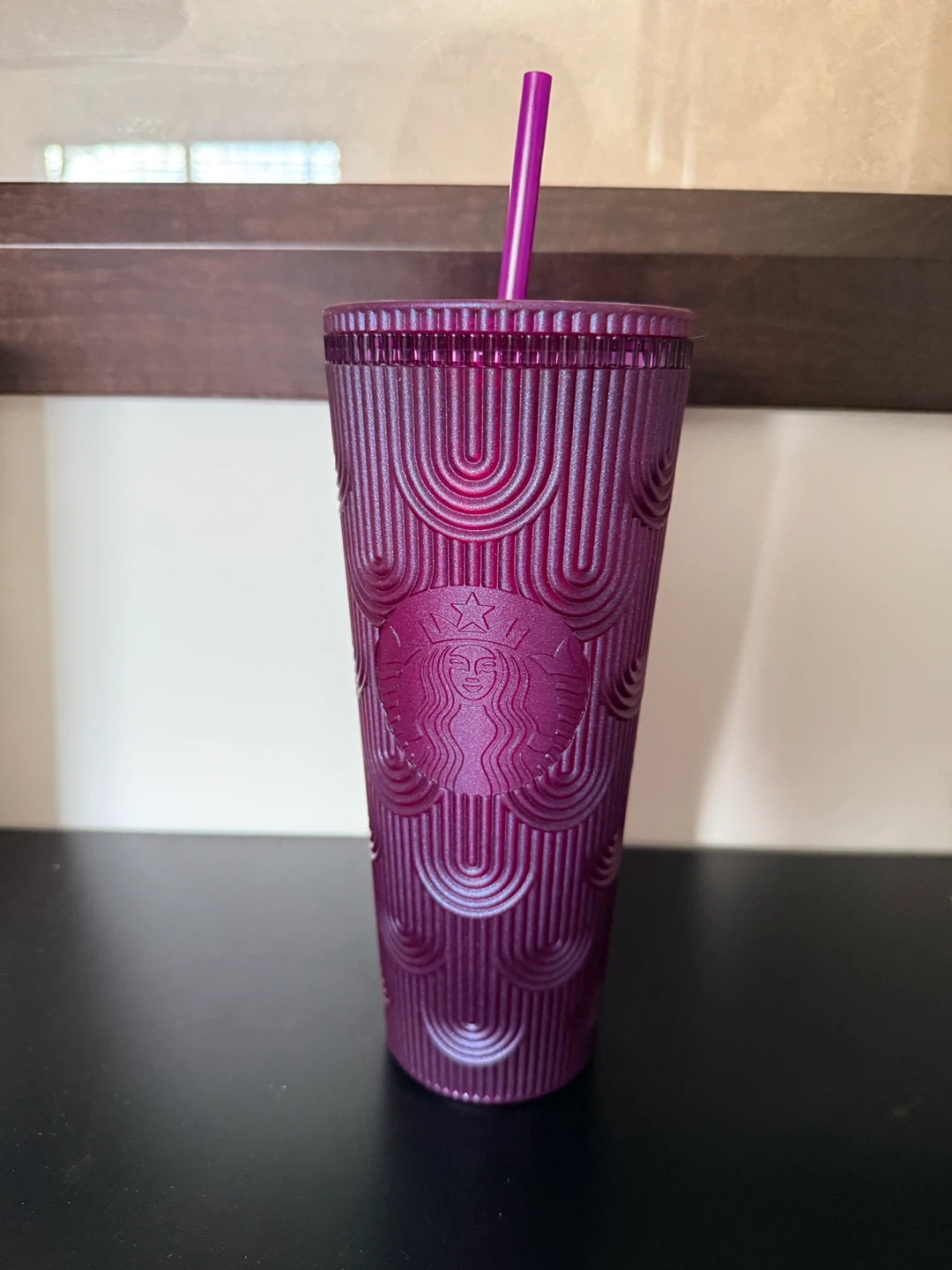 This is a reusable Starbucks tumbler in a deep purple colour. It has a textured design all around the cup and comes with a matching purple straw. It's perfect for enjoying your favourite cold beverages on the go!