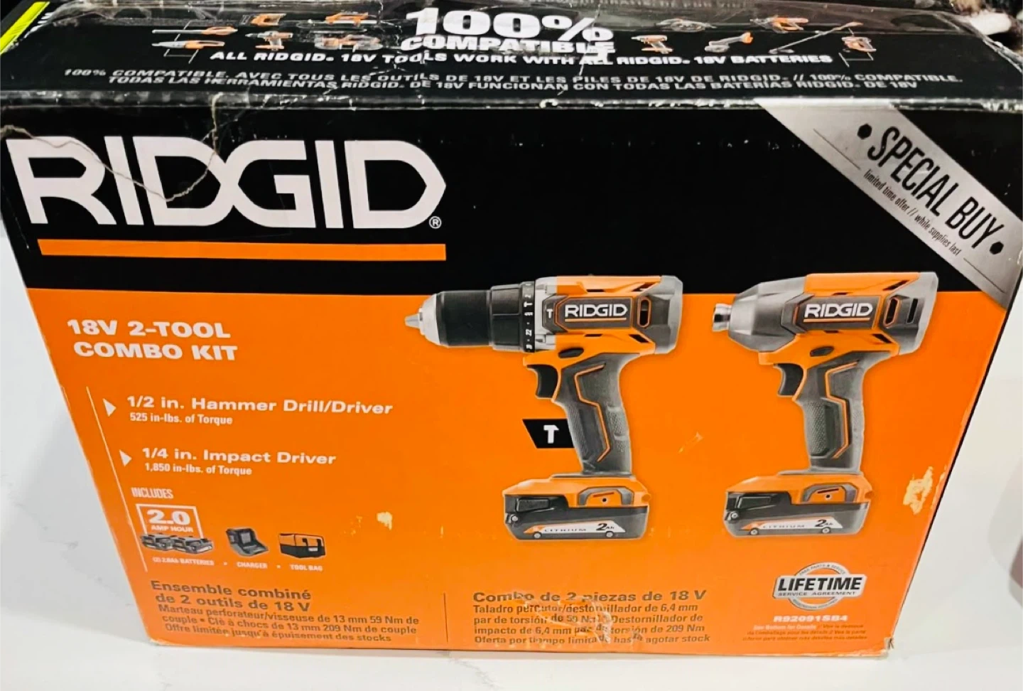 This is a RIDGID 18V 2-Tool Combo Kit featuring a 1/2 in. Hammer Drill/Driver with 525 in-lbs. of Torque and a 1/4 in. Impact Driver with 1,850 in-lbs. of Torque. The kit includes a 2.0 Amp Hour battery, charger, and tool bag.