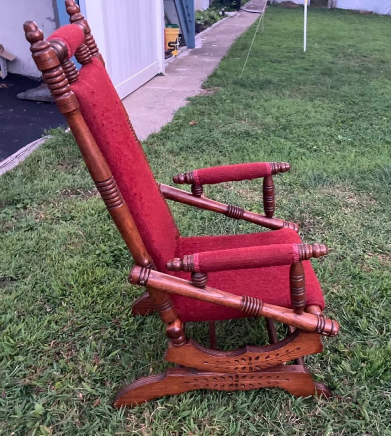This is a classic wooden rocking chair with deep red upholstered seat and back. It features ornate carvings on the base and turned wood accents on the arms and legs. It's a beautiful piece for any living room! Cash only !