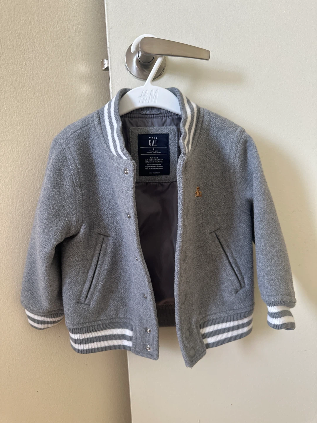 Baby Gap grey varsity jacket for toddlers. It's size 2. The shell is made with at least 60% cotton and 40% recycled polyester. Snap button closure.