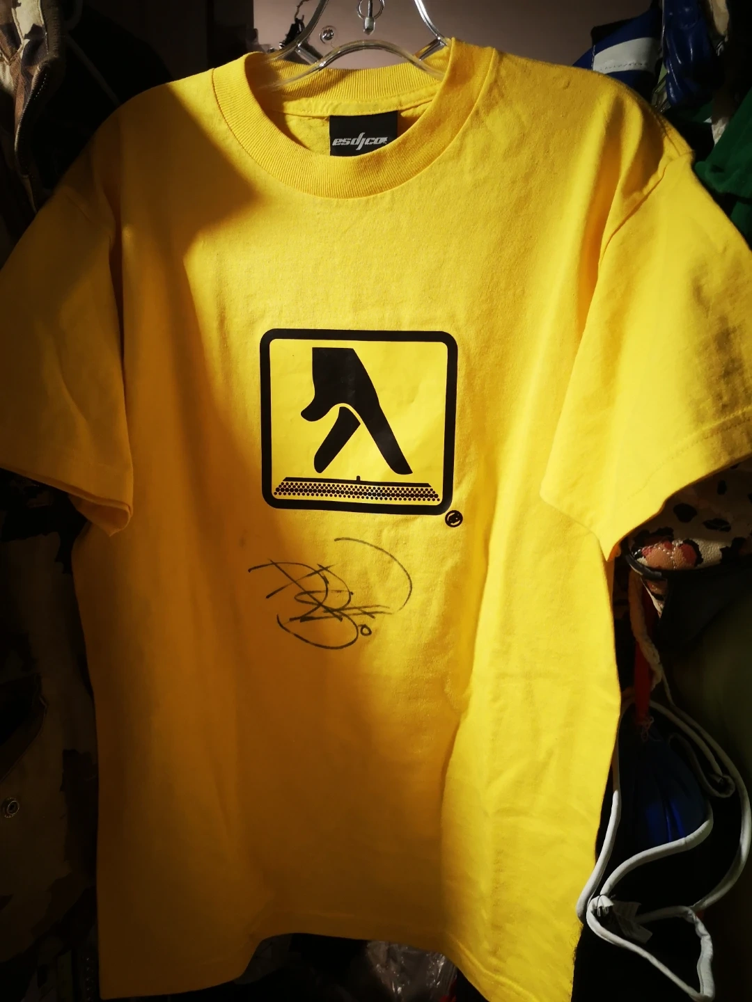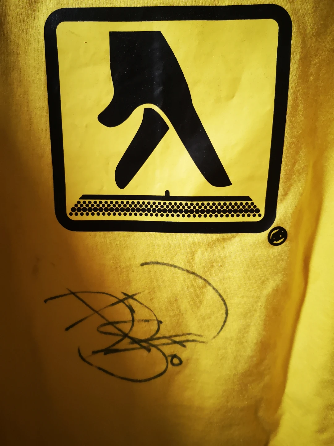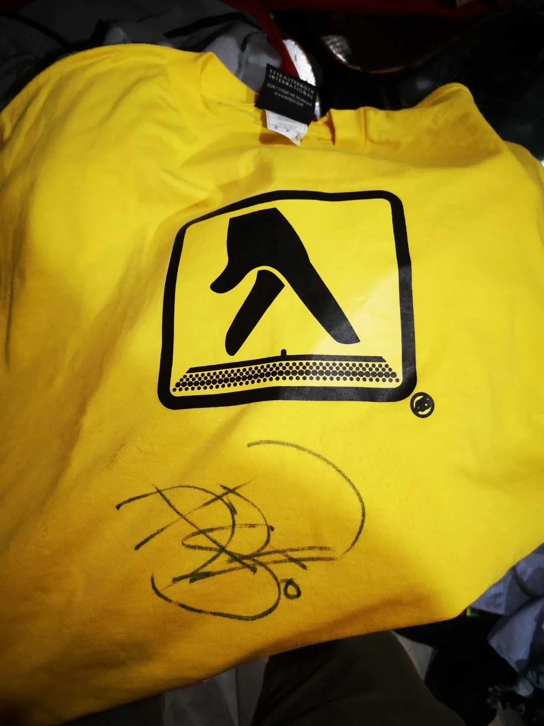 Yellow short-sleeved t-shirt featuring the iconic Aphex Twin logo. It's signed by the artist. Cotton material.