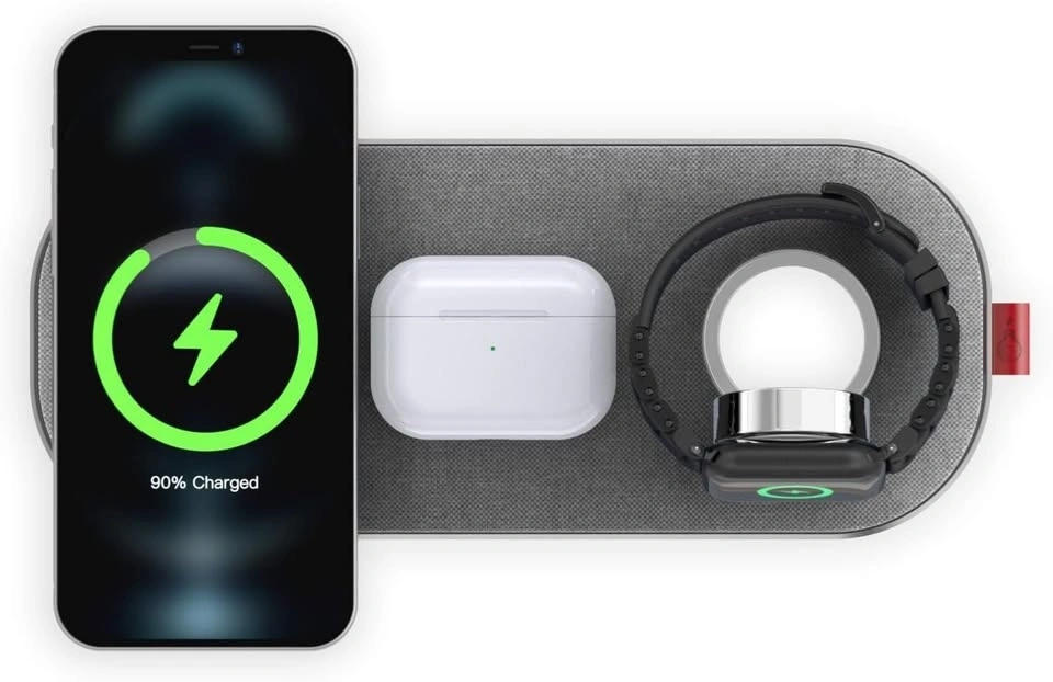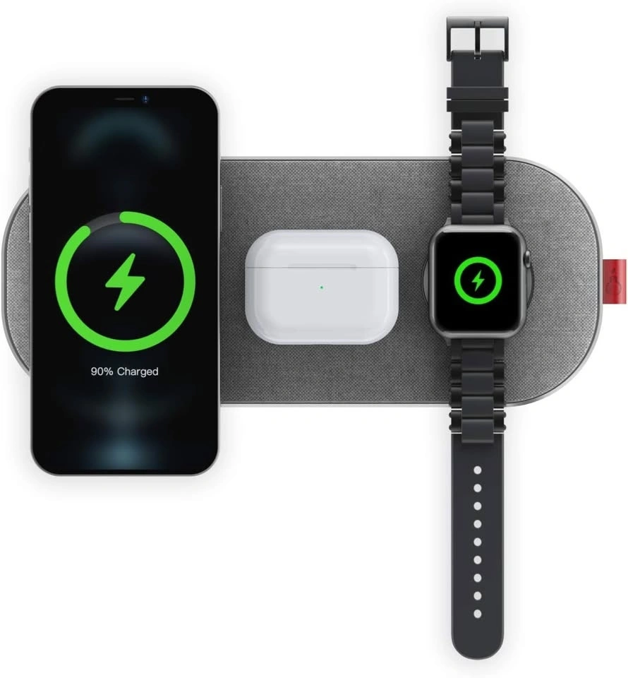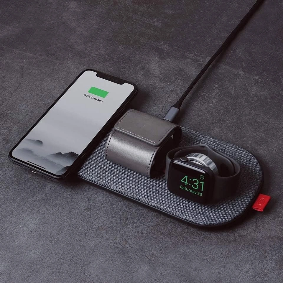 Slice charge Pro, 6-Coils Wireless Charging Mat. This is versatile as it can charge an apple watch and it can also charge up to 2 phones simultaneously. Comes with the required cable and electric brick. It can be used to charge your phone, earphones and the watch or 2 phones and the watch.