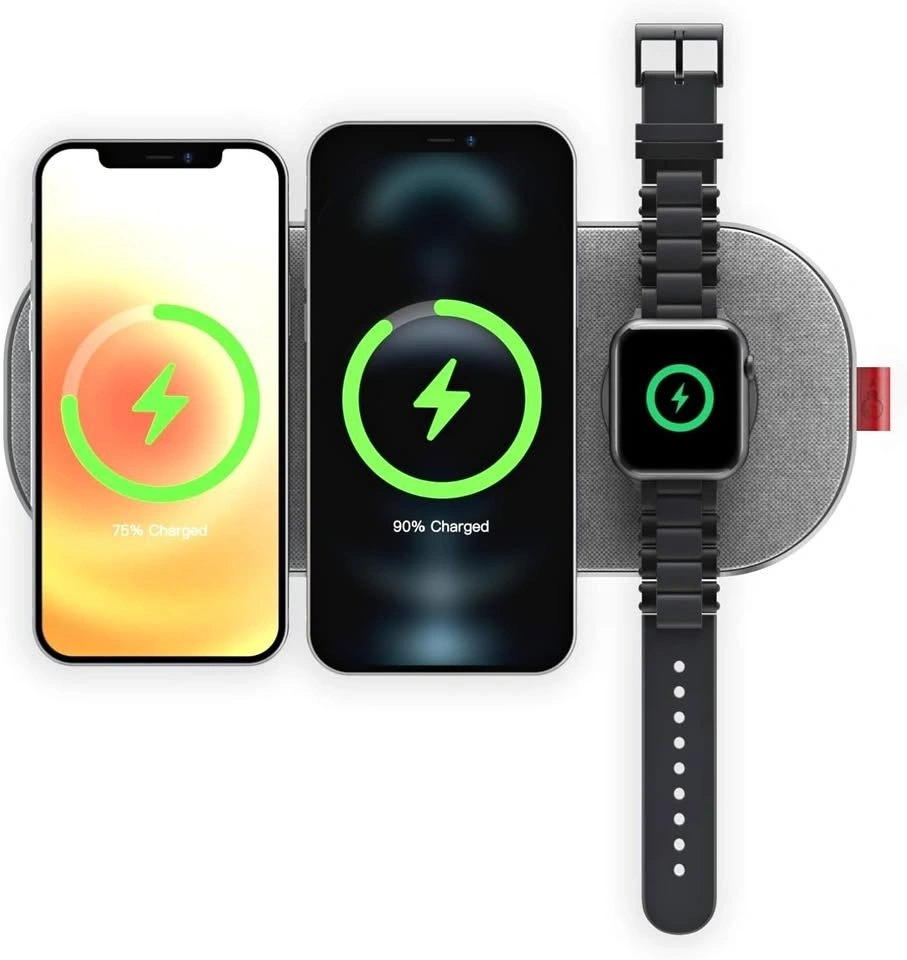 Slice charge Pro, 6-Coils Wireless Charging Mat. This is versatile as it can charge an apple watch and it can also charge up to 2 phones simultaneously. Comes with the required cable and electric brick. It can be used to charge your phone, earphones and the watch or 2 phones and the watch.