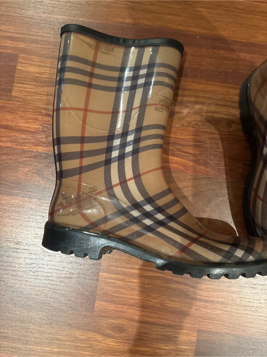 Burberry rubber rain boots with the iconic Nova check pattern. Features black trim and soles. Perfect for keeping your feet dry on rainy days!