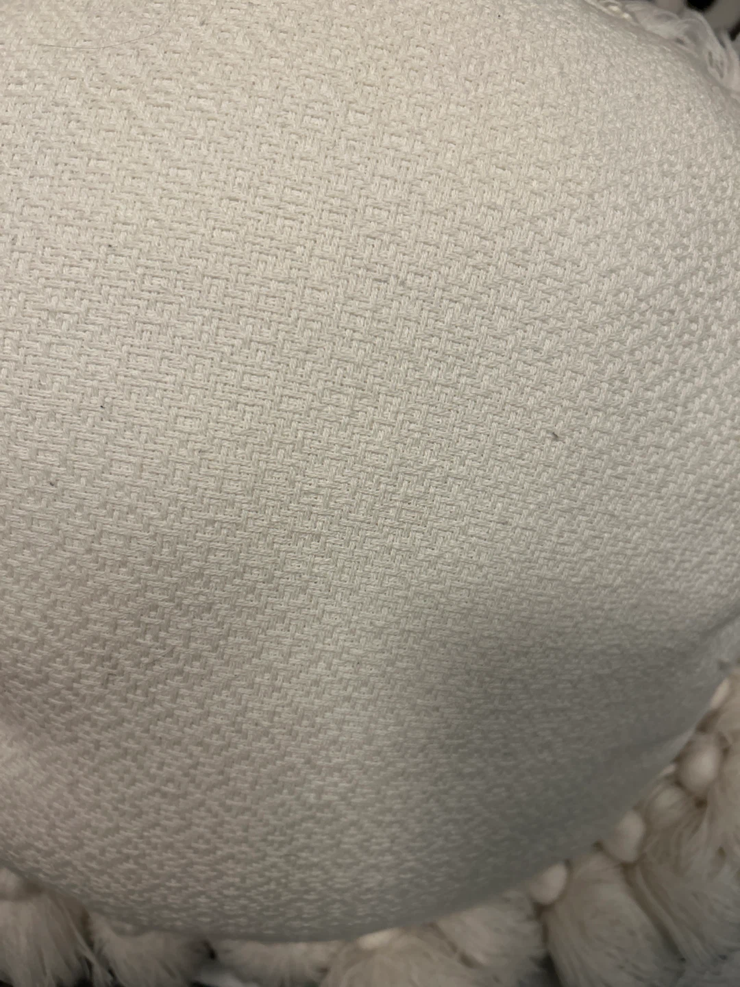 Textured cream throw pillow. It has a woven fabric design. Tassels around the edge add a nice touch! This pillow would be a cozy addition to any living room or bedroom.