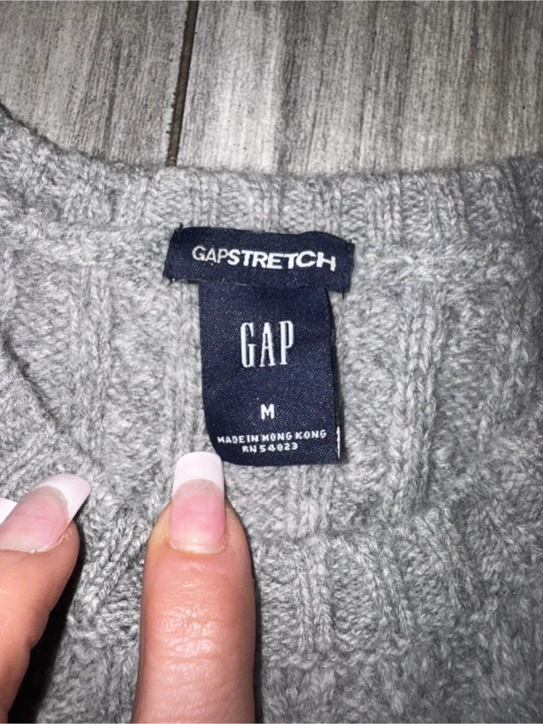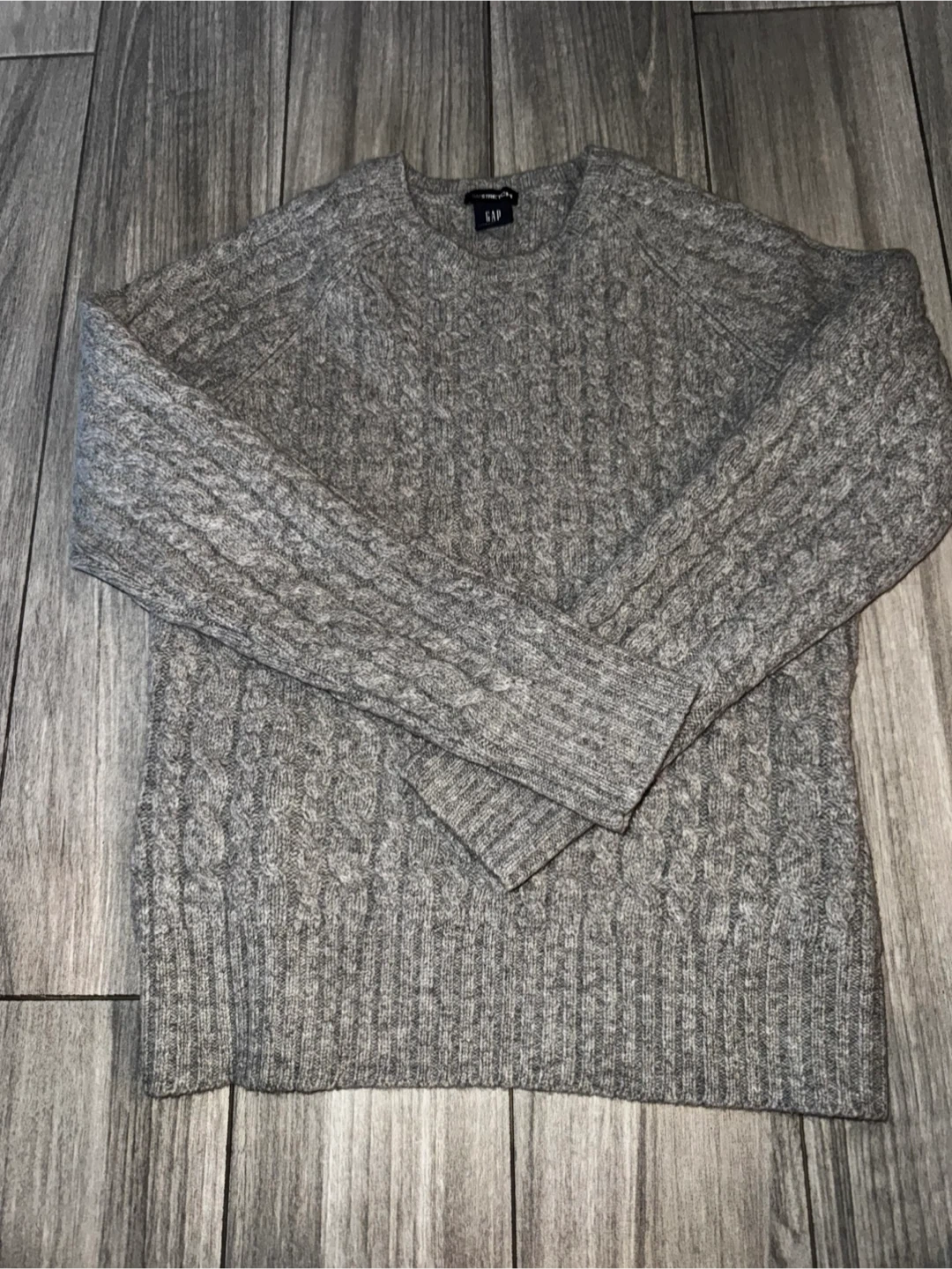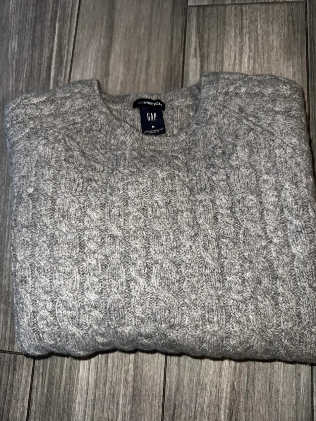 Grey cable knit sweater from Gap. It's made with 98% lambs' wool, 1% Lycra, and 1% other fiber. Size medium.