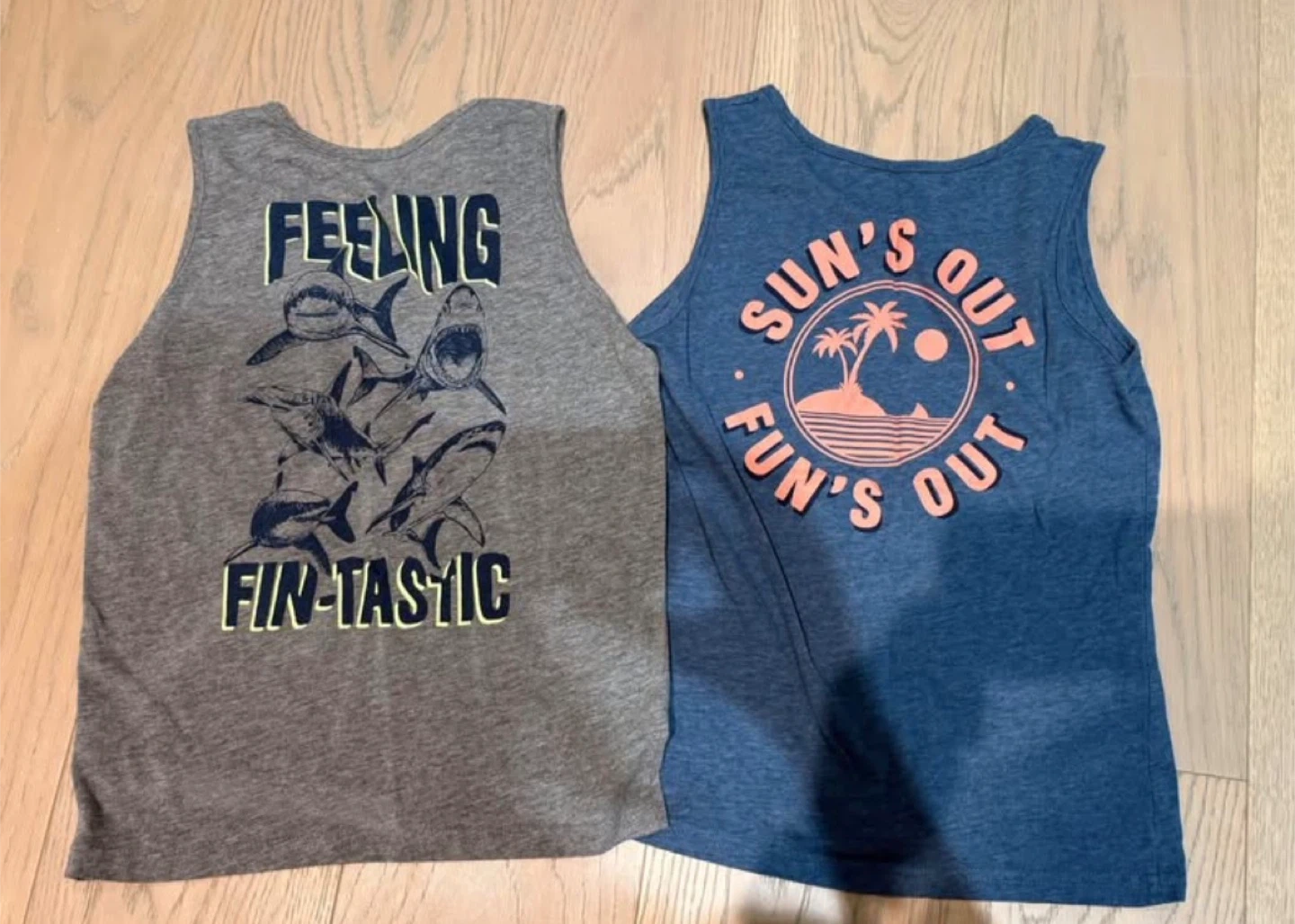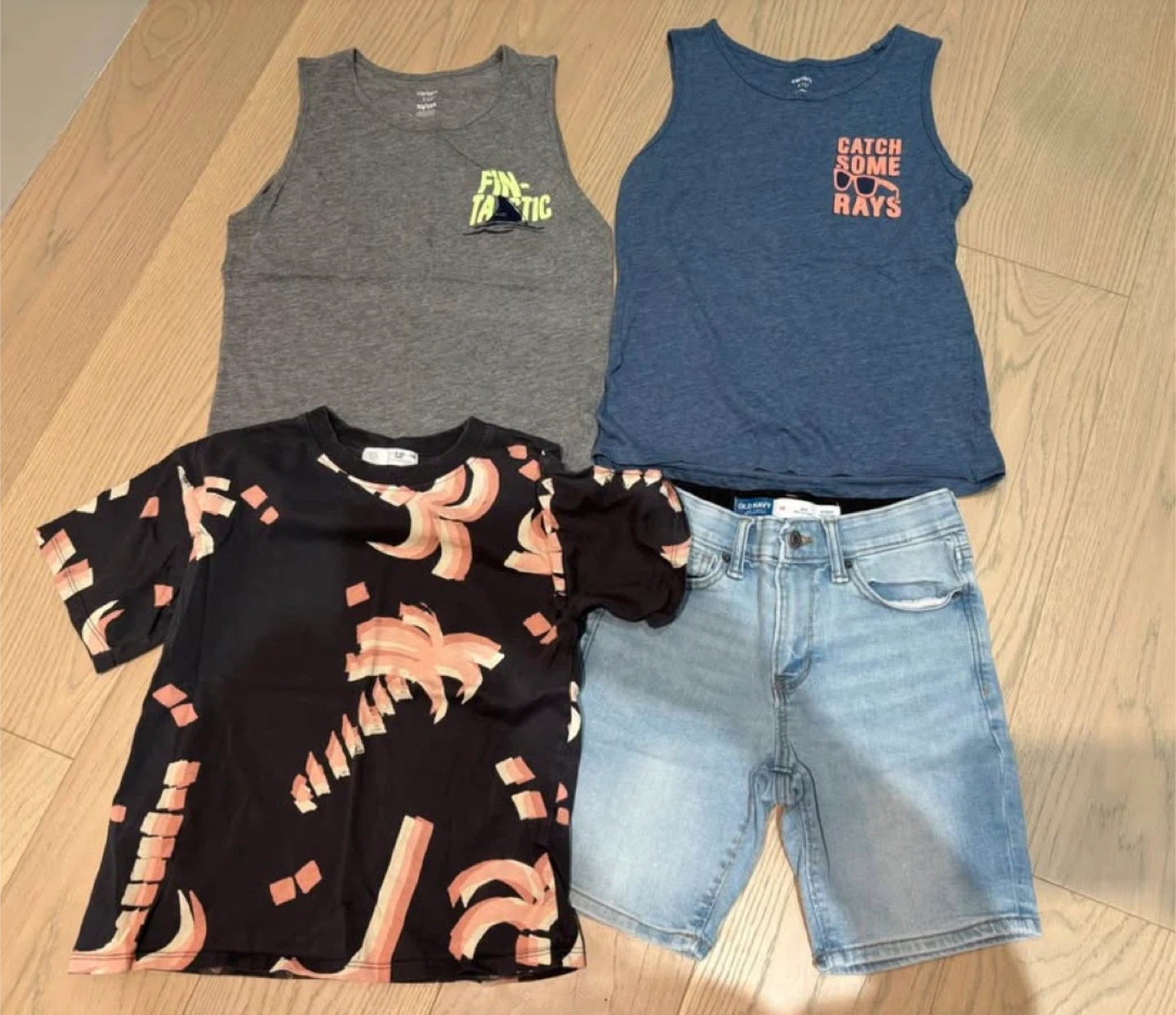 Selling a collection of boys' clothing, including a pair of Old Navy jean shorts in size 10! They are a light wash denim colour. Also included are two tank tops and a patterned t-shirt.