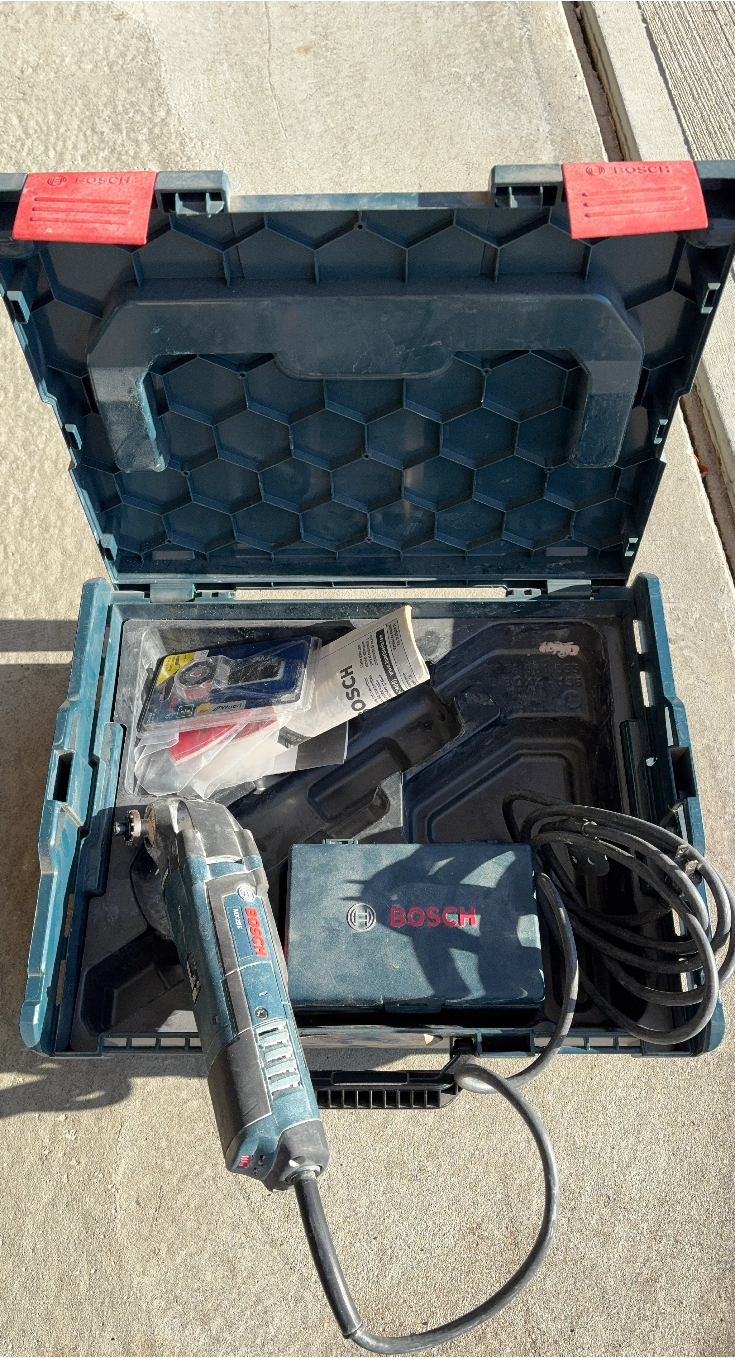 Bosch MX25E oscillating multi-tool in its case. It comes with a wood blade and instructions. This tool is great for cutting, sanding, and scraping.