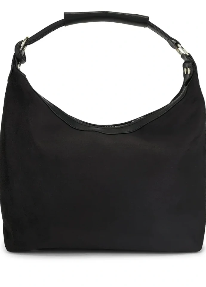 faux Leather & suede exterior w textile lining , top magnetic button closure one main co,partment, interior zipper & slip pocket intergrated shoulder strap