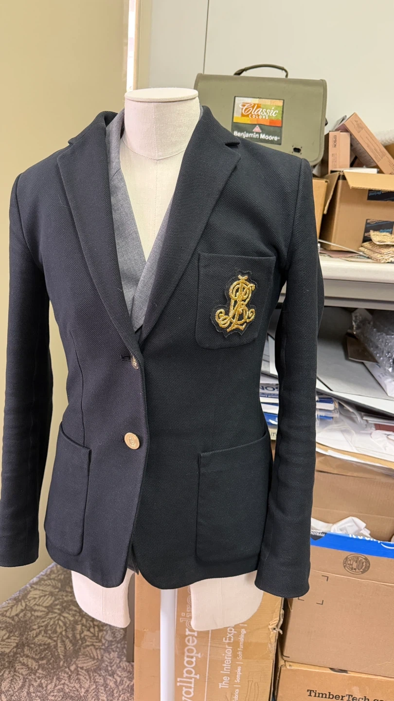 A classic black blazer from Ralph Lauren! It has a textured fabric and a gold-colored button. The blazer also features a stylish gold embroidered logo on the pocket. It's in great condition, size Small