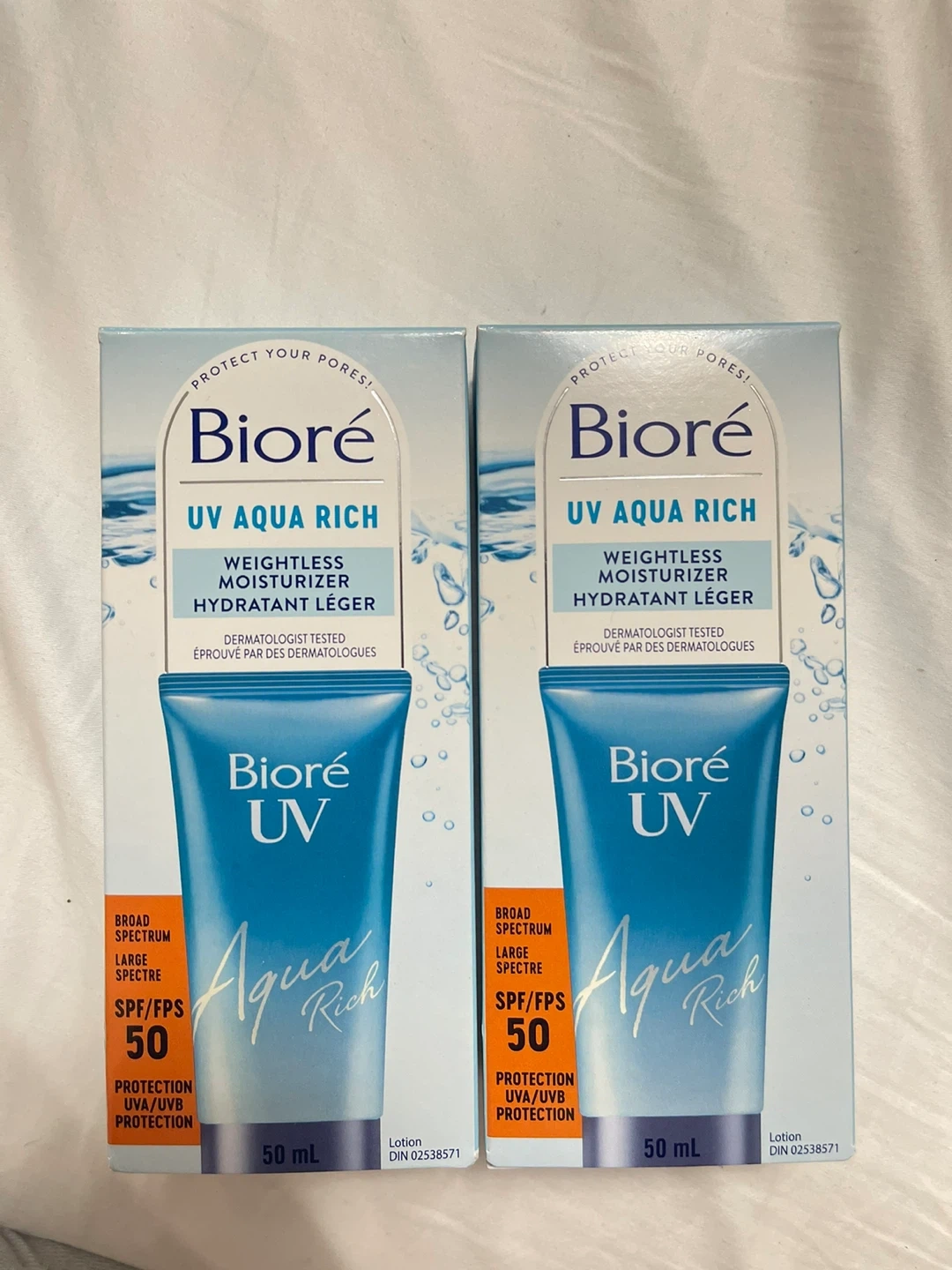 This is Biore UV Aqua Rich weightless moisturizer with SPF 50. It's a broad spectrum, water-rich formula for UVA/UVB protection. The lotion is 50 mL and comes in a duo pack. Dermatologist tested.