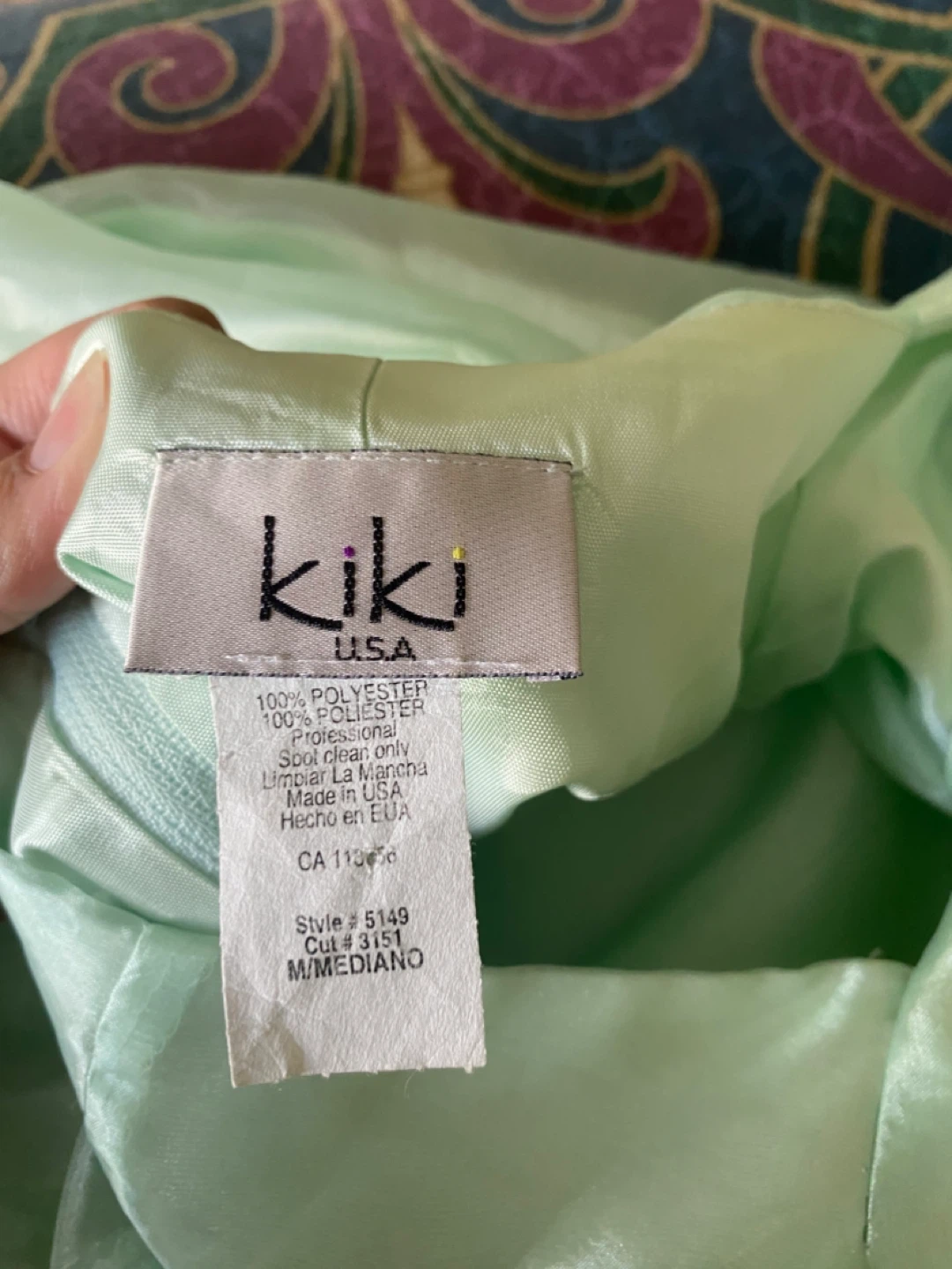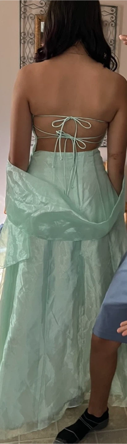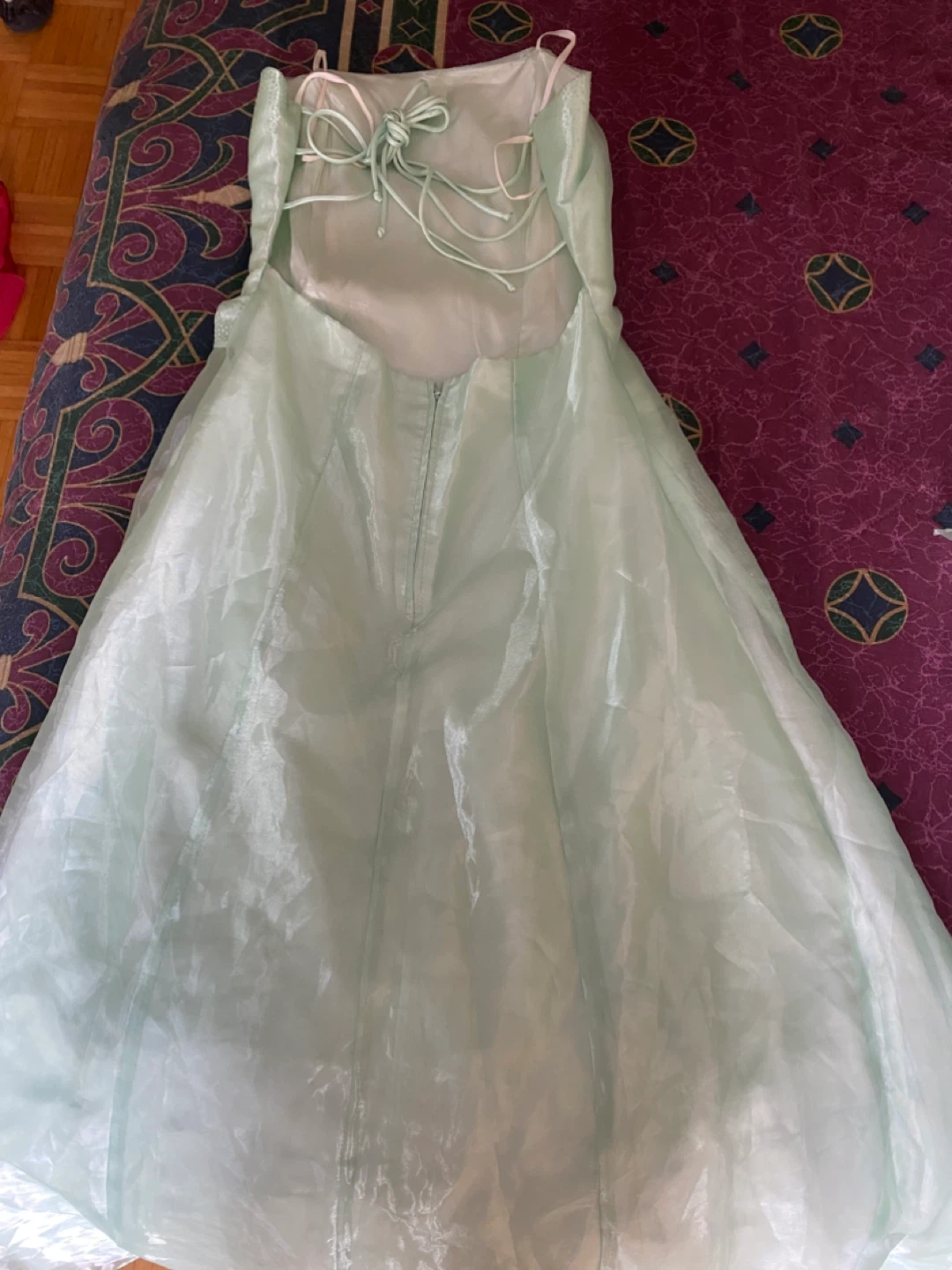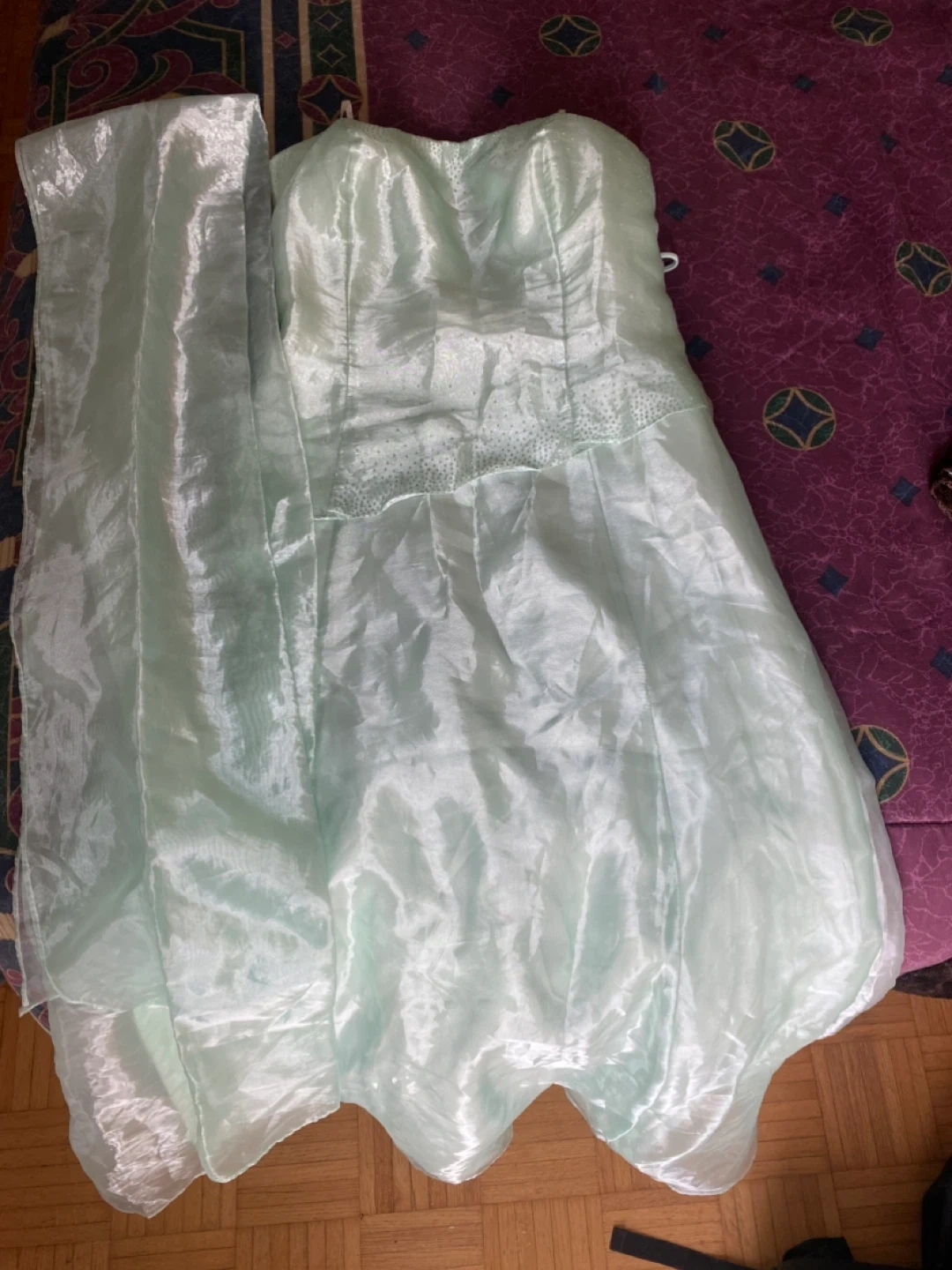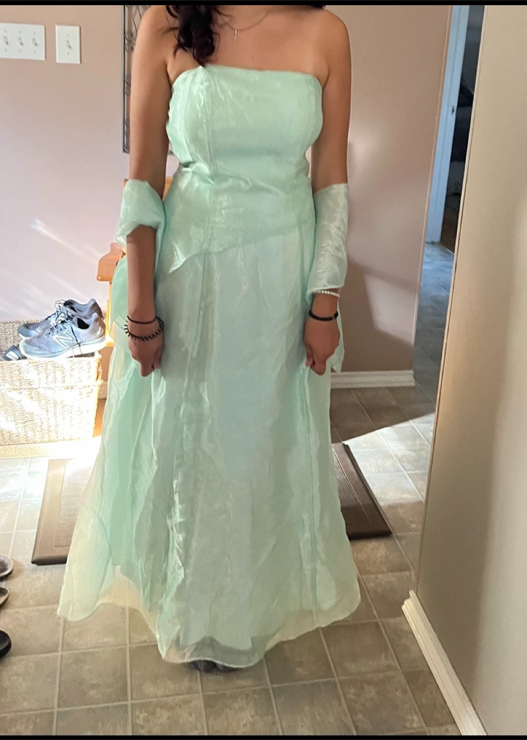 Vintage Strapless mint green formal gown with a shimmering finish and some beads on the top. It's a size medium. Includes a matching scarf. Perfect for a formal event or grad.