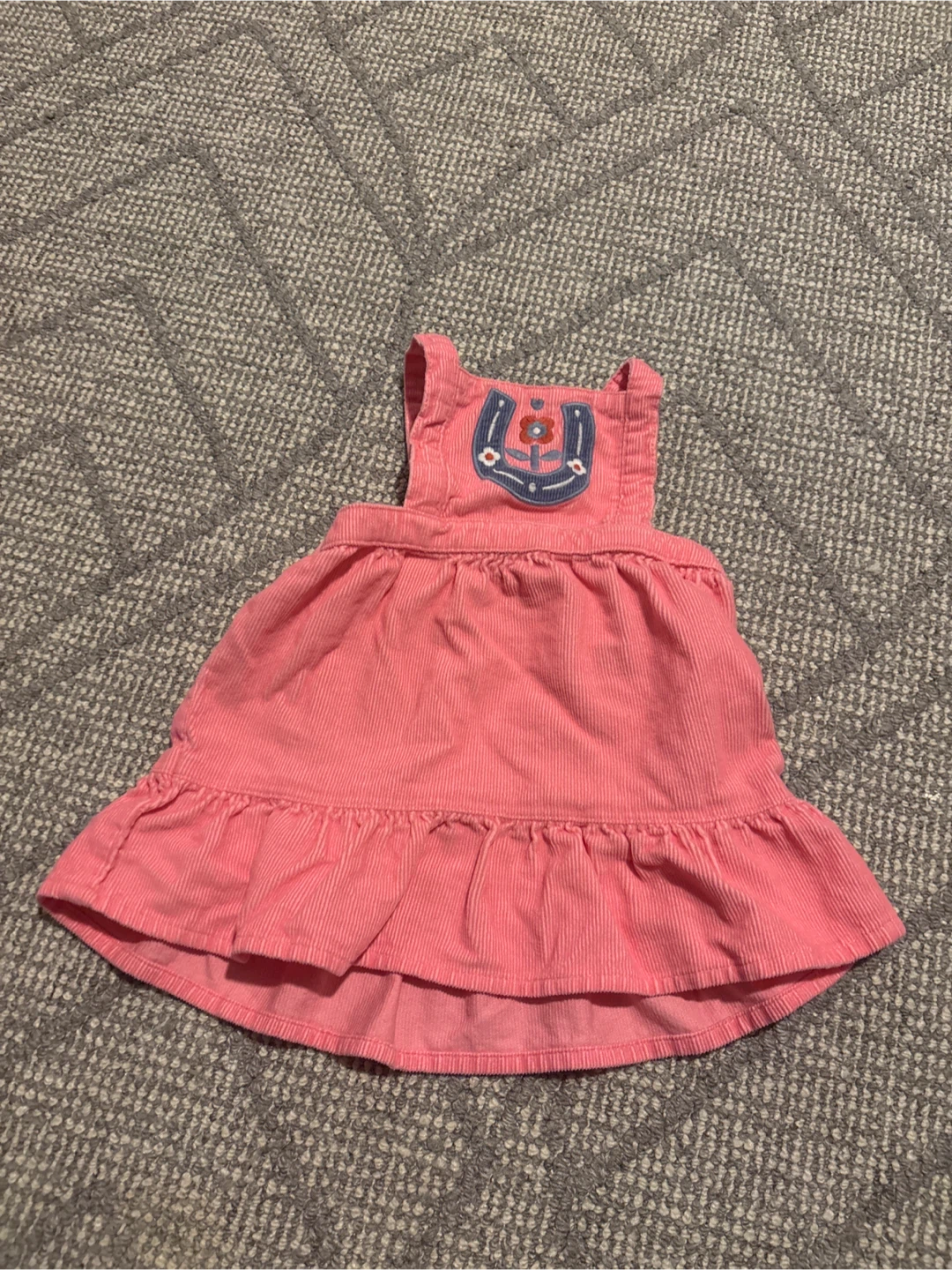 A cute pink corduroy pinafore dress for a little one. It features a sweet horseshoe and flower embroidery on the bib. The dress has a ruffled hemline, perfect for playtime or special occasions. Made from soft corduroy material.