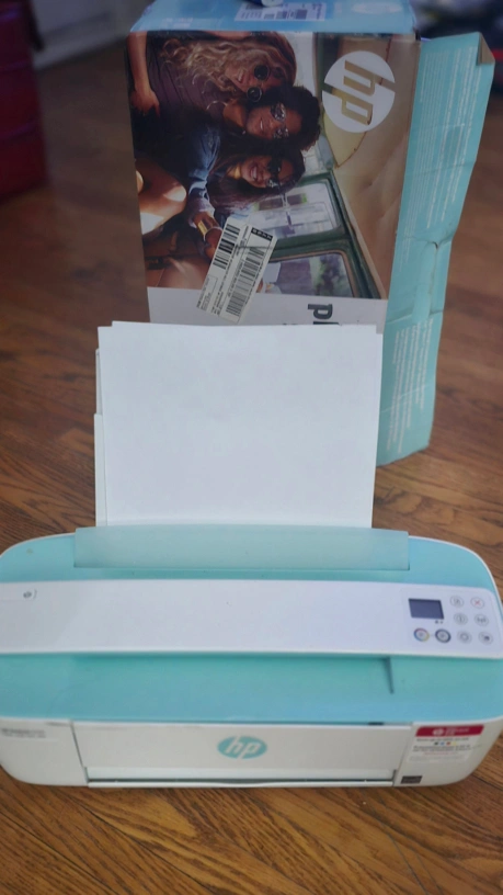 Compact home printer. Mint green colour. Includes power cord. Wireless printing capabilities. Prints, scans, and copies.