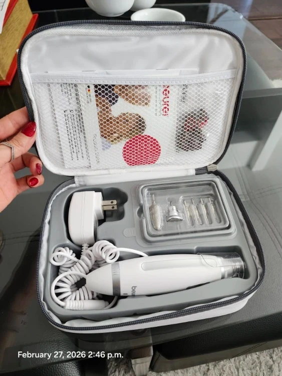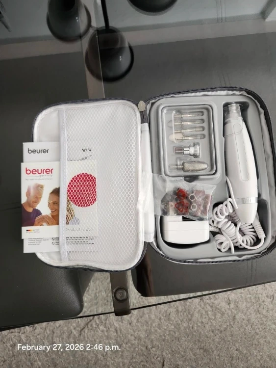Complete Beurer manicure and pedicure set with multiple attachments and a charging adapter. It includes various filing and shaping bits for nail care. Comes with a convenient travel case.