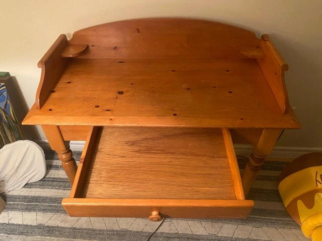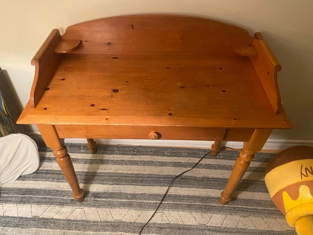 Sturdy little desk in good shape. Some scratches that might be able to cover with a wood product. I gave it a little lemon oil already. Hope it finds a good home and gets lots of use. Widest is 38 1/4”, deepest is 18”, desk top is 30” high. Asking $50. Pickup in Peterborough East end.