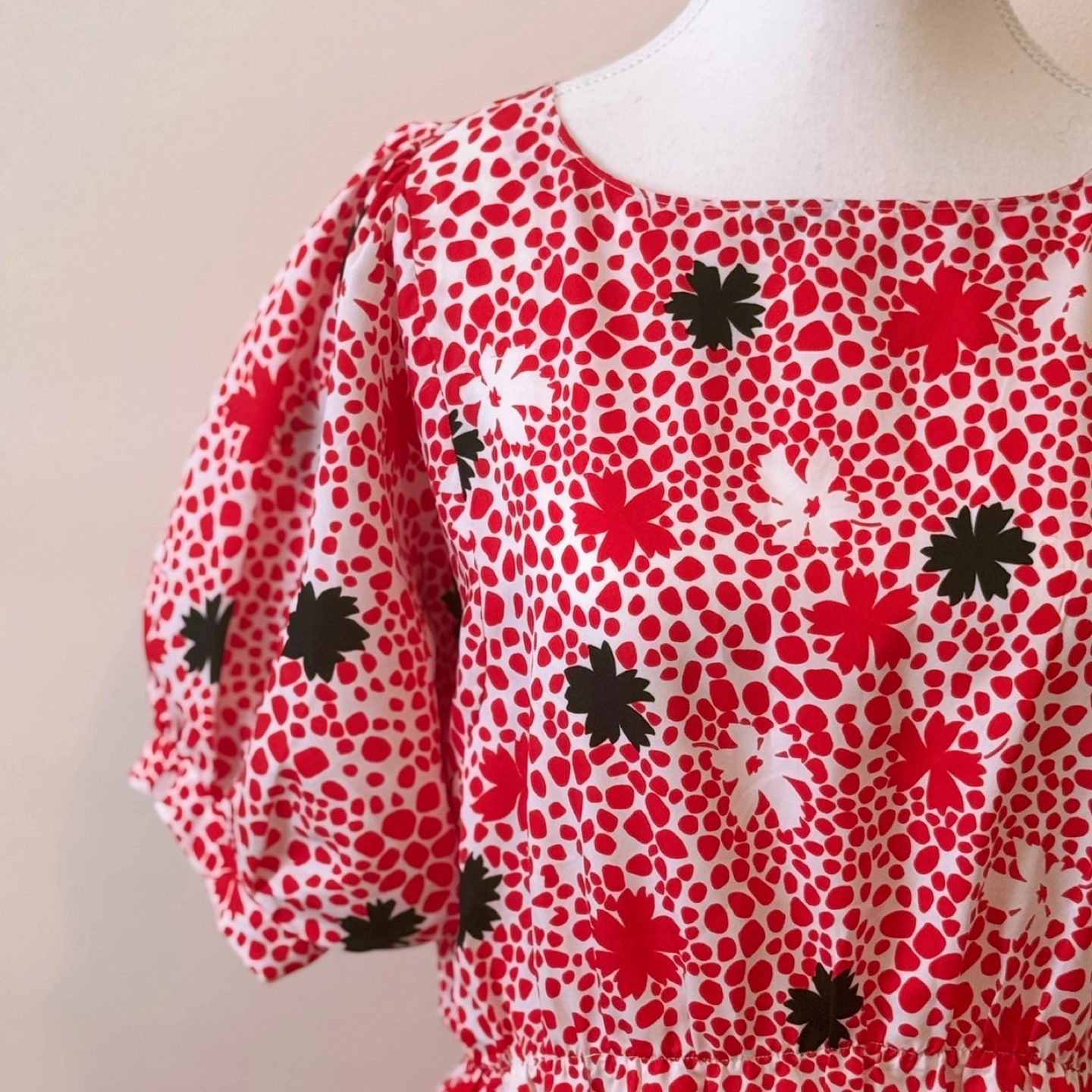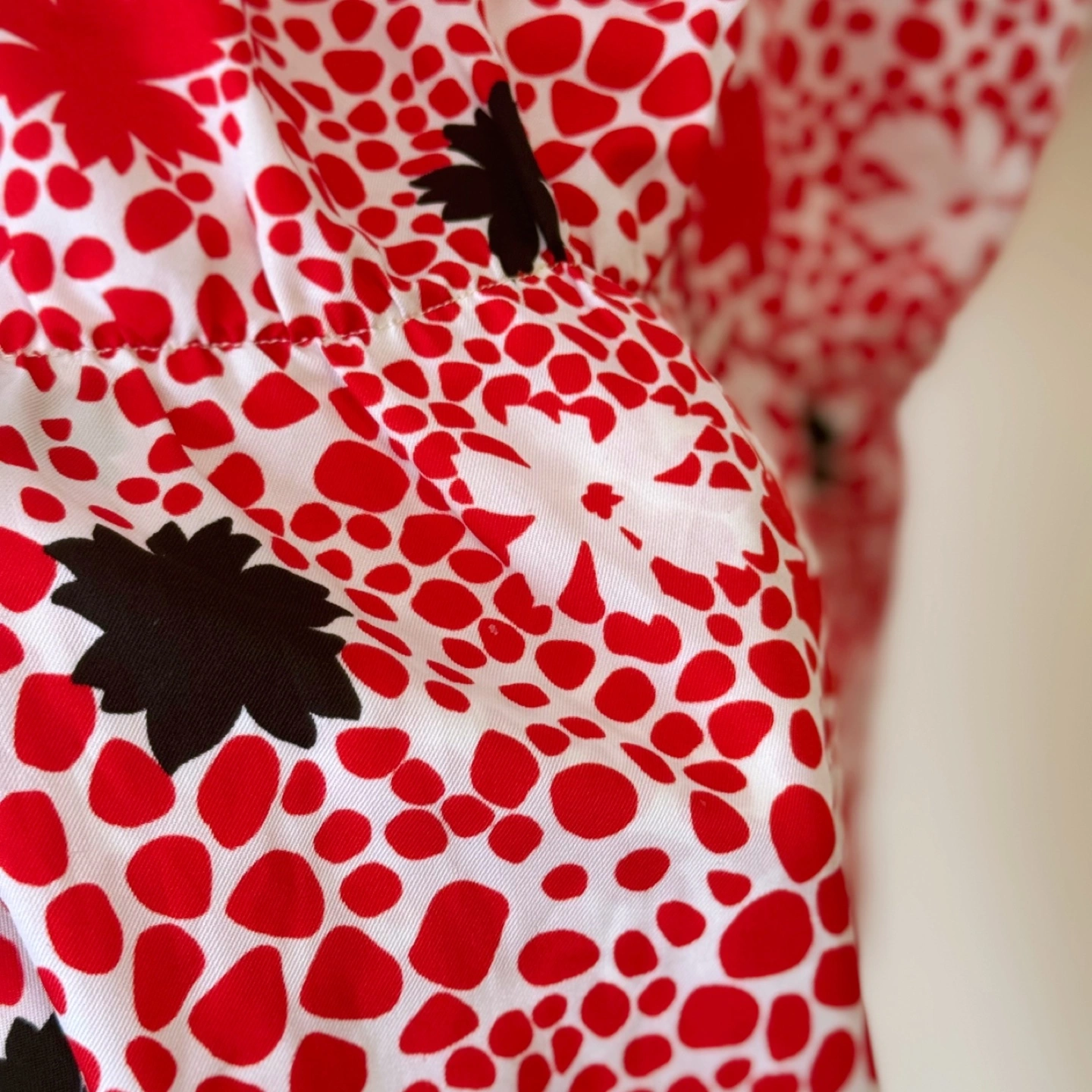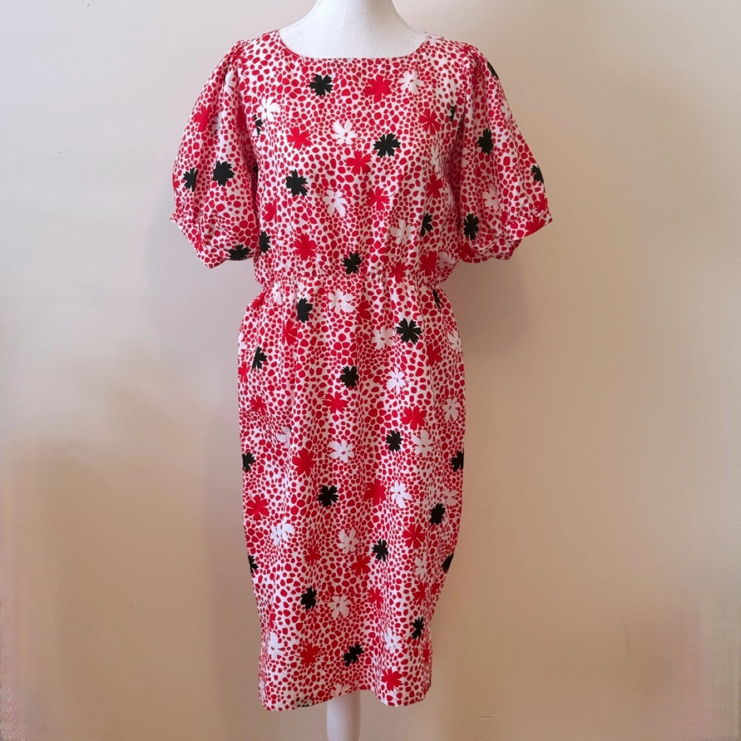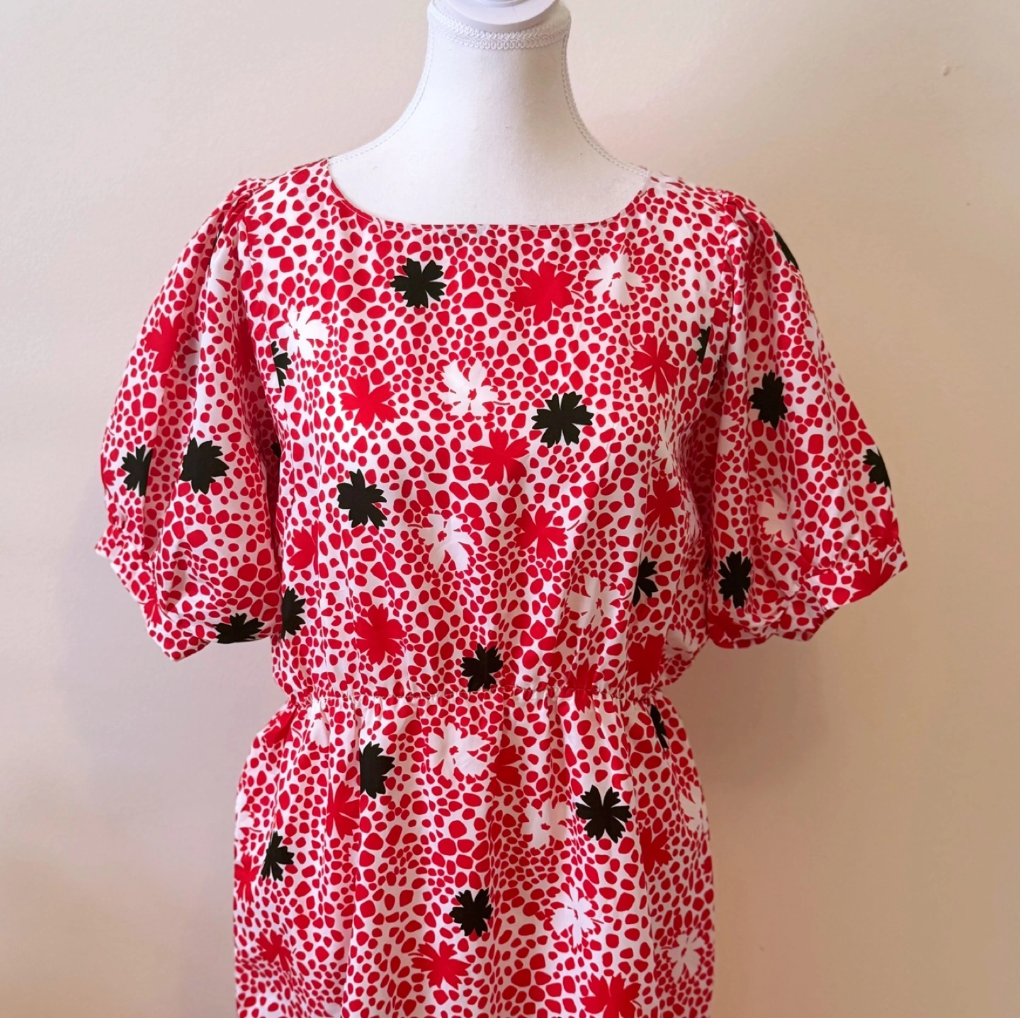 A vibrant vintage dress featuring a playful floral print in red, black, and white. The puffed sleeves add a romantic touch, while the elastic waist ensures a comfortable and flattering fit. The lightweight fabric makes it perfect for warm weather, giving a breezy and effortless feel.