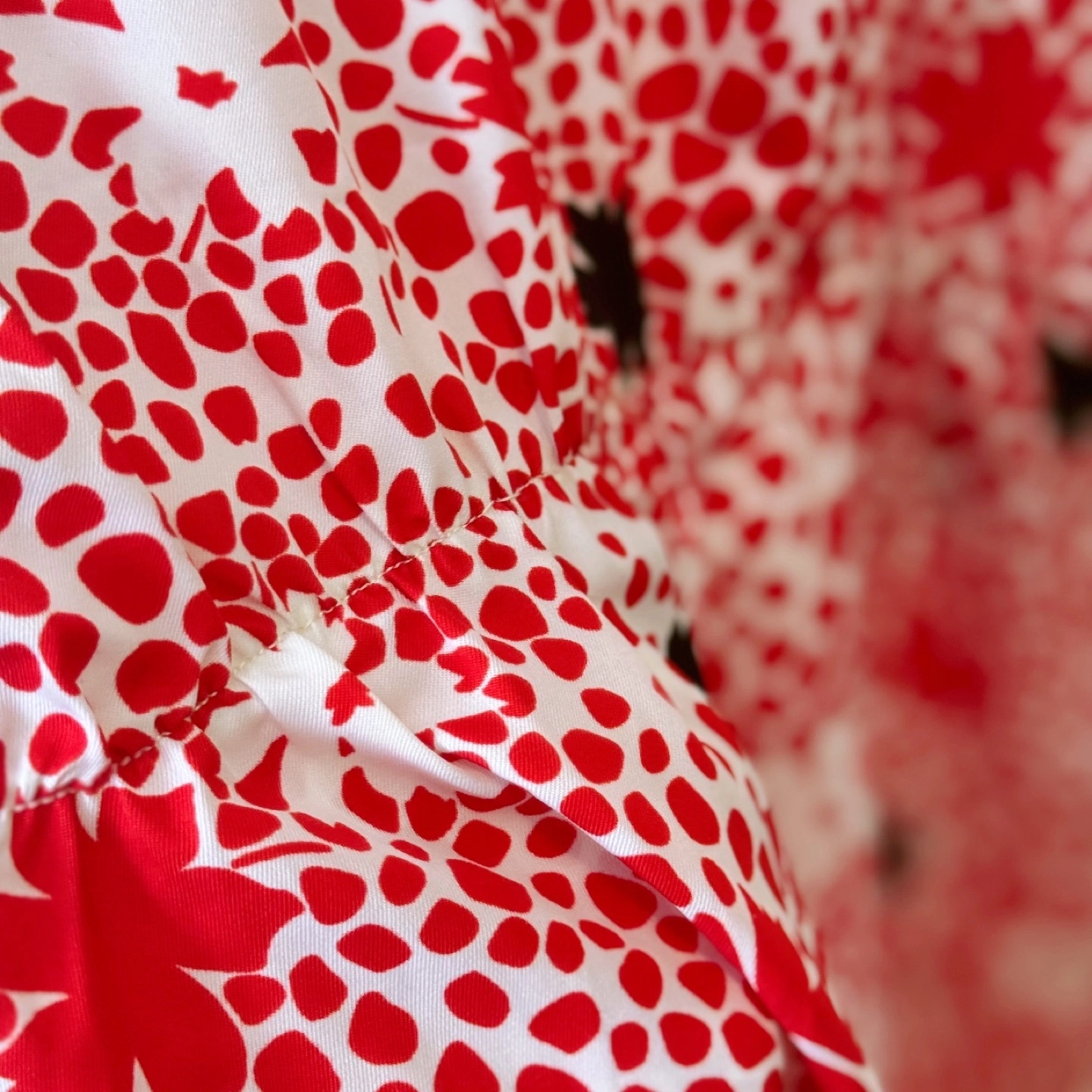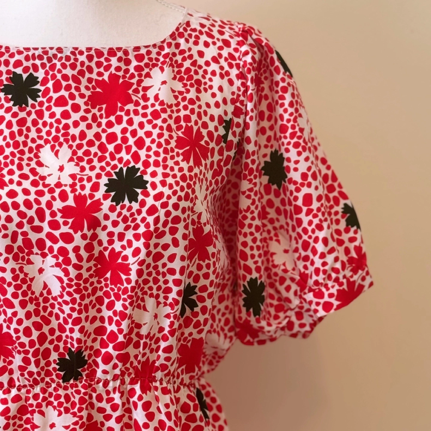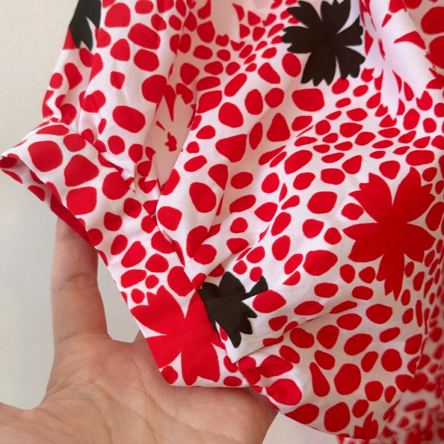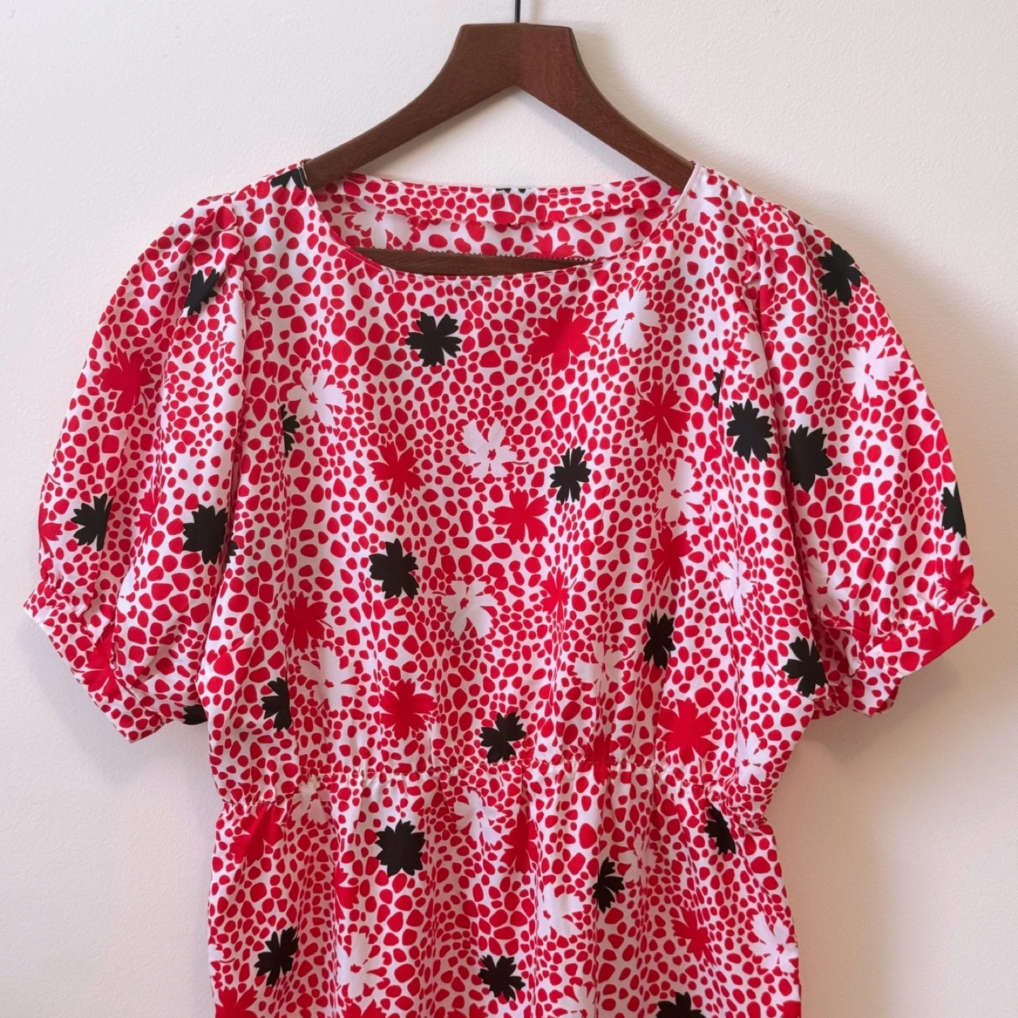 A vibrant vintage dress featuring a playful floral print in red, black, and white. The puffed sleeves add a romantic touch, while the elastic waist ensures a comfortable and flattering fit. The lightweight fabric makes it perfect for warm weather, giving a breezy and effortless feel.