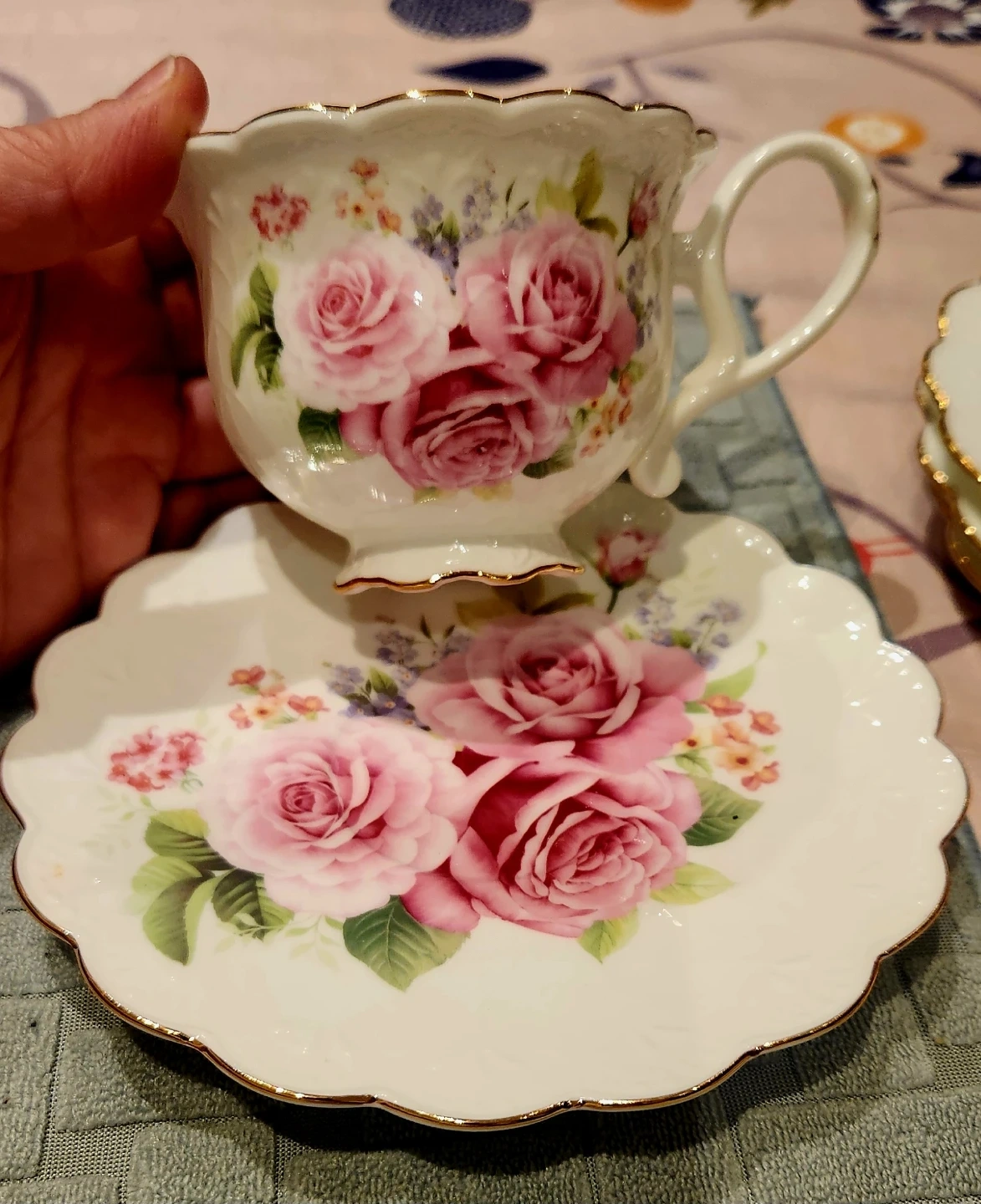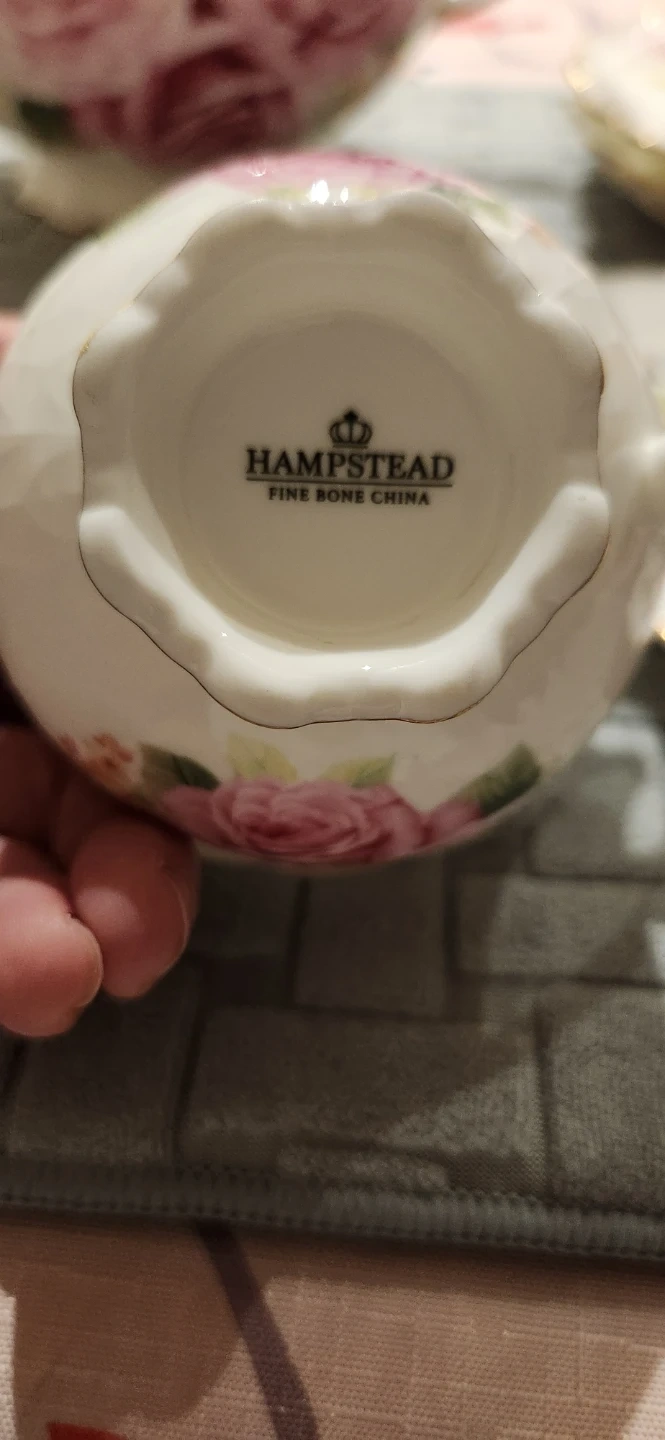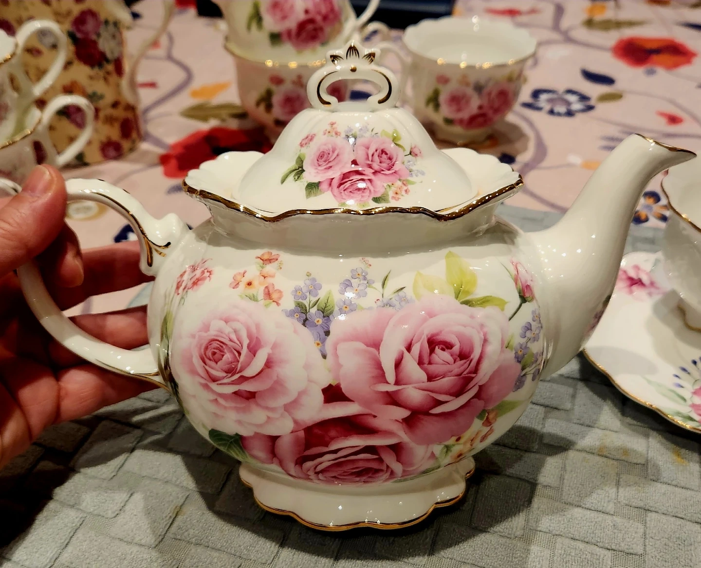 This Hampstead Fine Bone China tea set features a beautiful floral design with pink roses and purple accents. It includes a teapot and multiple cups and saucers. The gold trim adds a touch of elegance to each piece. Set of 8 tea cups and saucers.