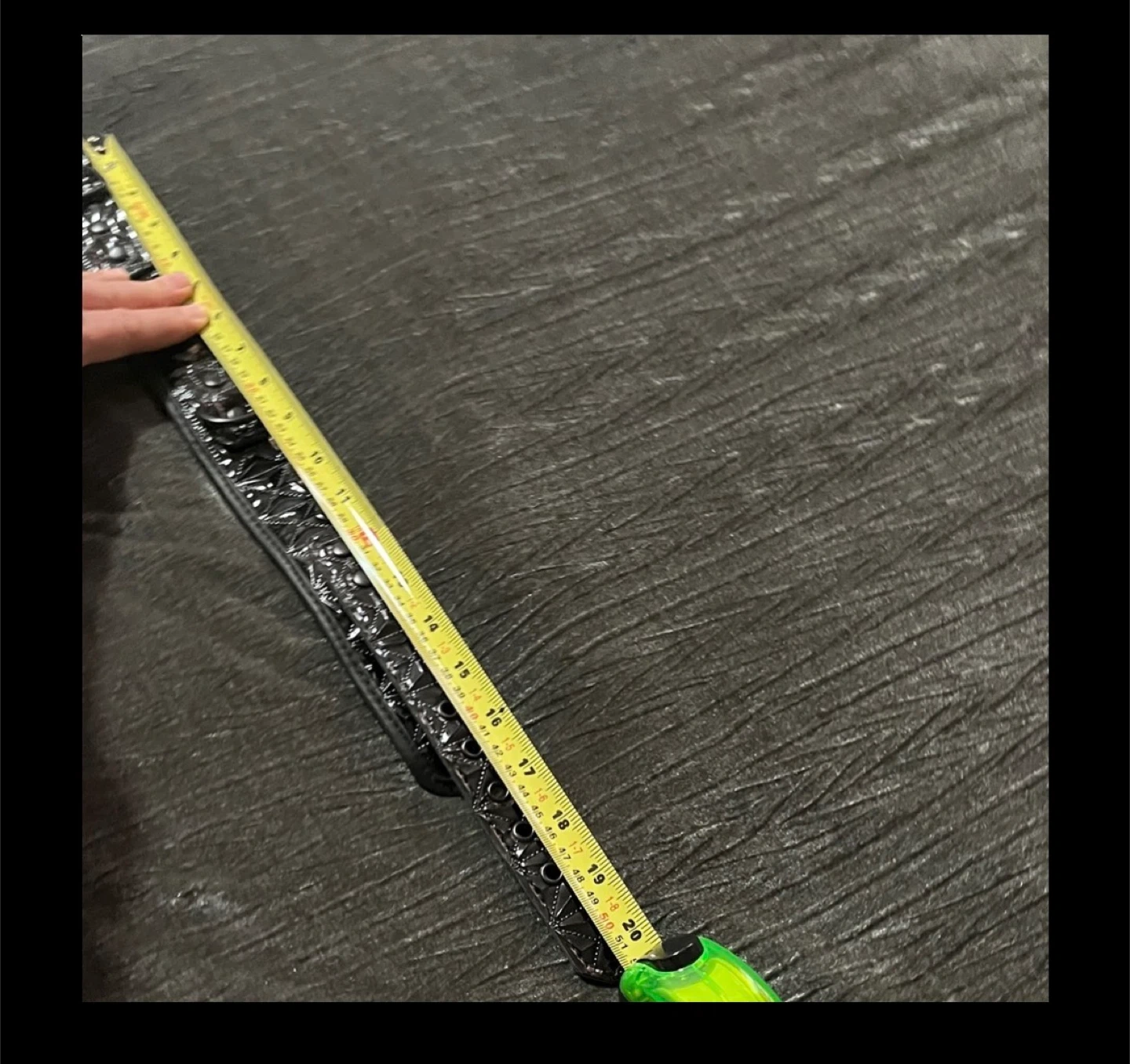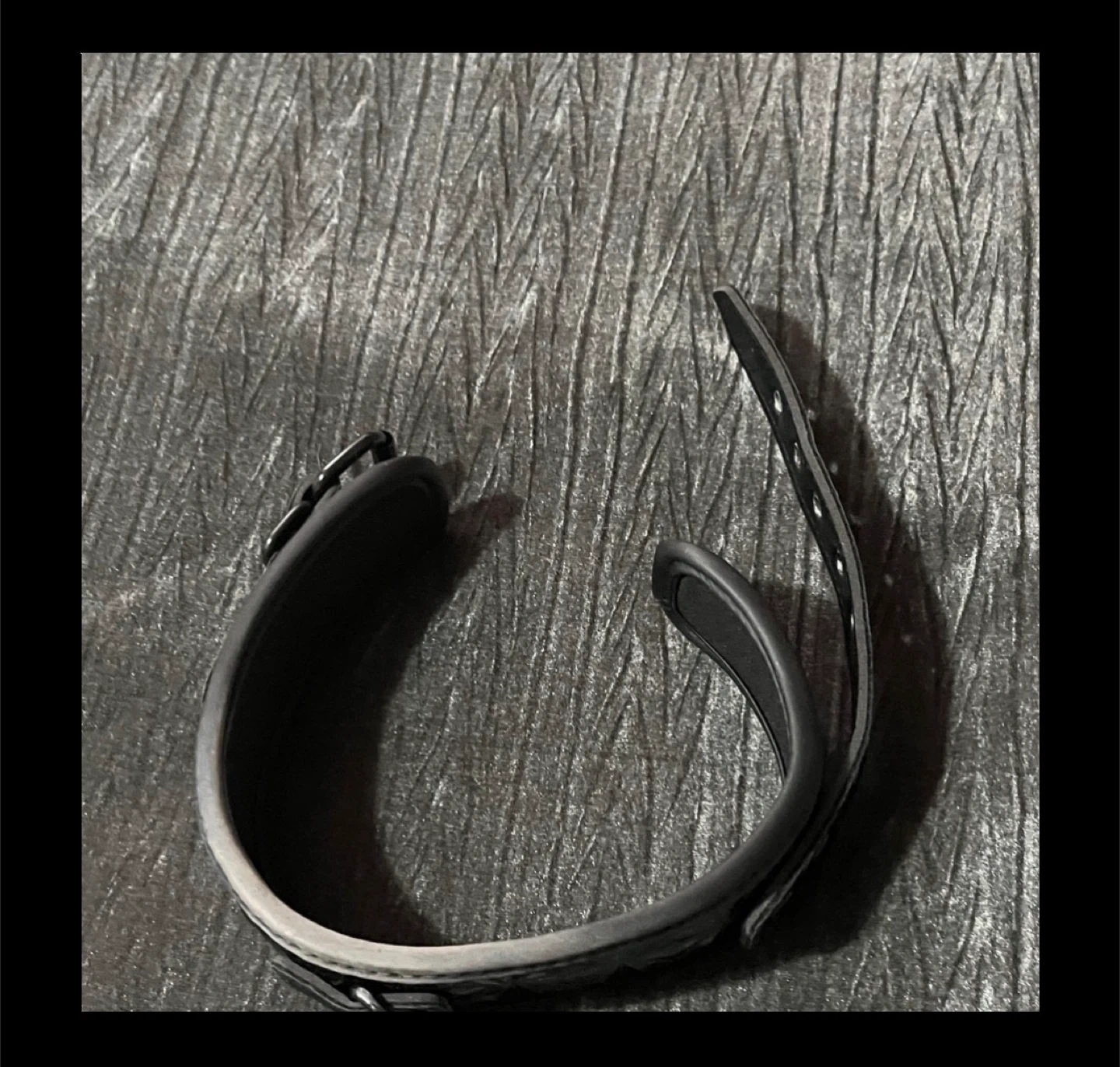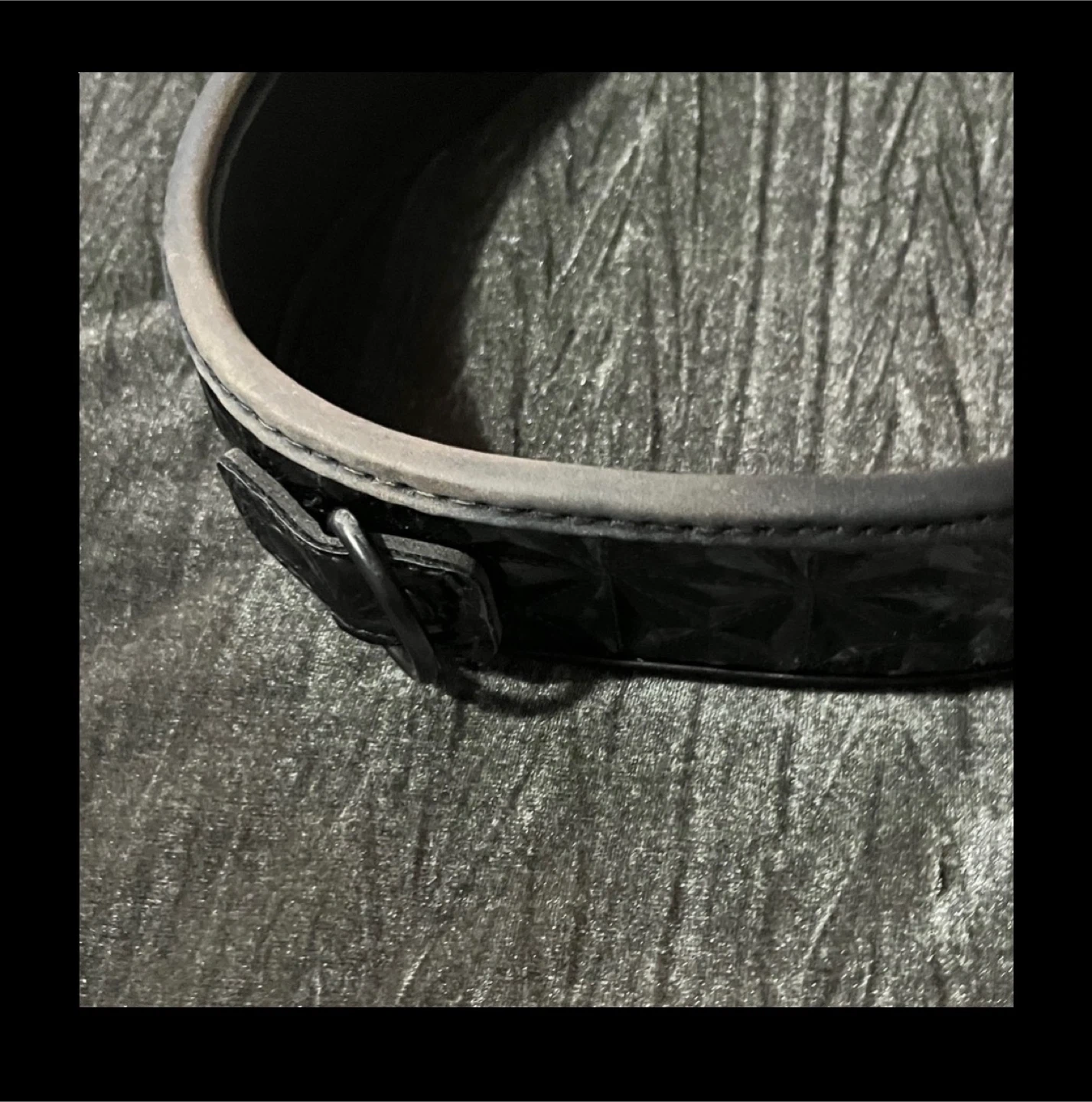 Black collar with a quilted patent leather finish and a metal D-ring. Adjustable strap with buckle closure. Measures approximately 16-20 inches.