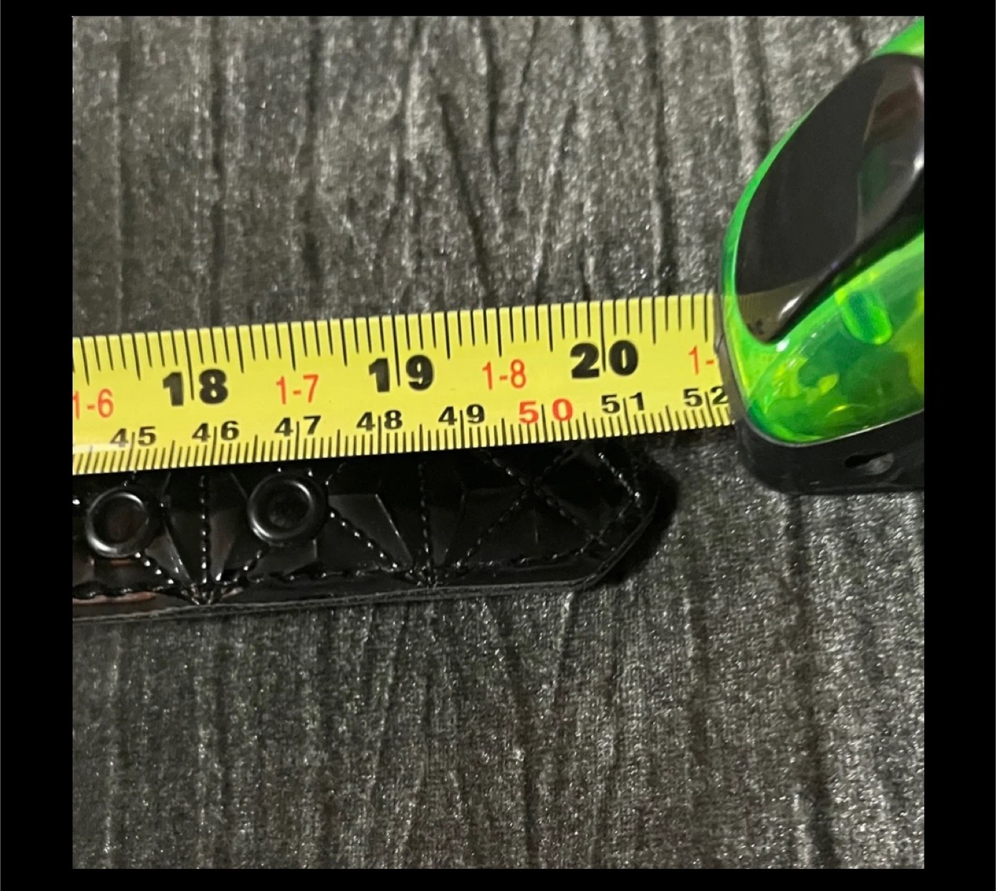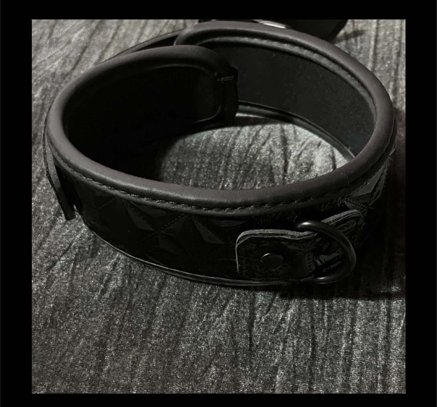 Black collar with a quilted patent leather finish and a metal D-ring. Adjustable strap with buckle closure. Measures approximately 16-20 inches.