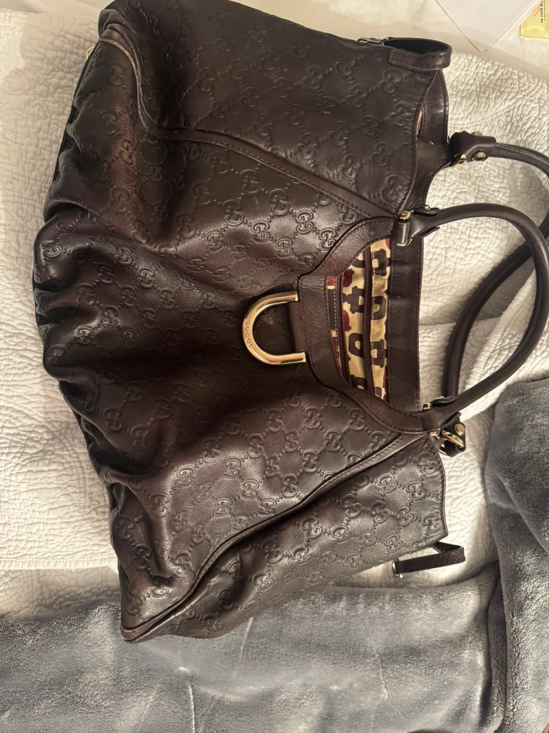 Beautiful Gucci hobo bag in dark brown leather. It features an allover embossed GG logo pattern and a distinctive patterned interior lining. This stylish bag has dual top handles and gold-tone hardware. A great accessory for everyday use!