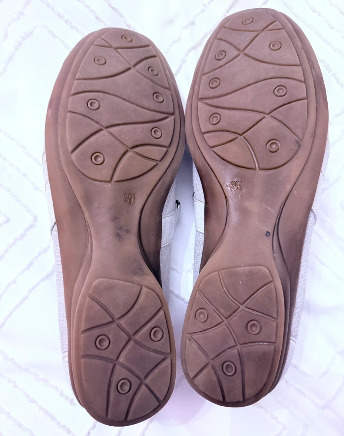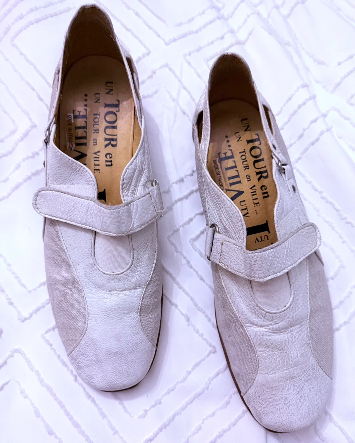 Selling a pair of "Un Tour en Ville" shoes. They are a women's size 39 1/2 and are in good condition. They feature a velcro strap and a unique design. Great for casual wear!