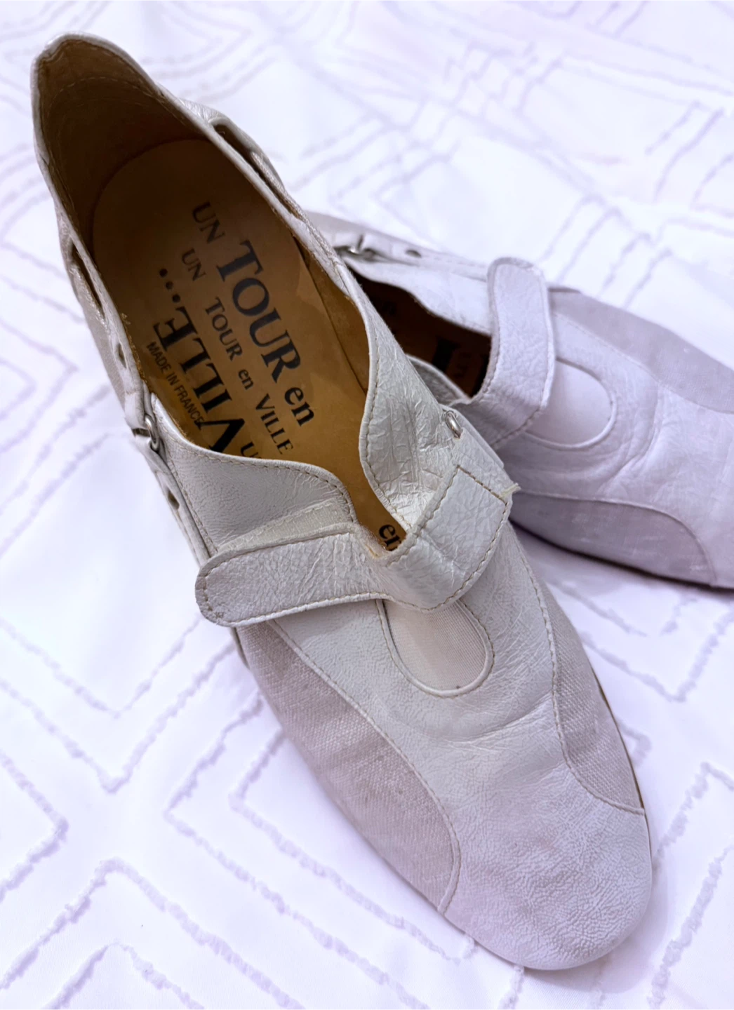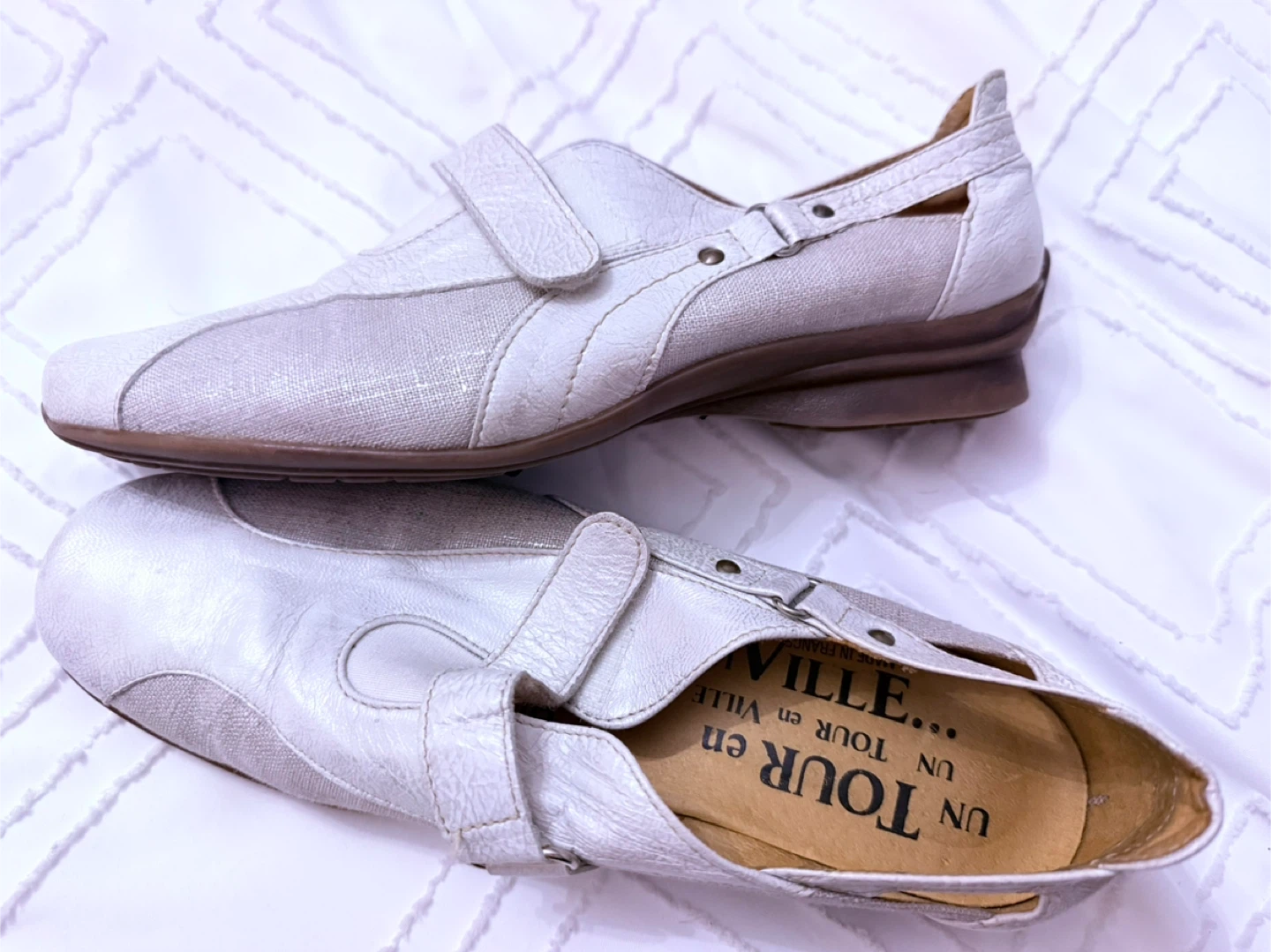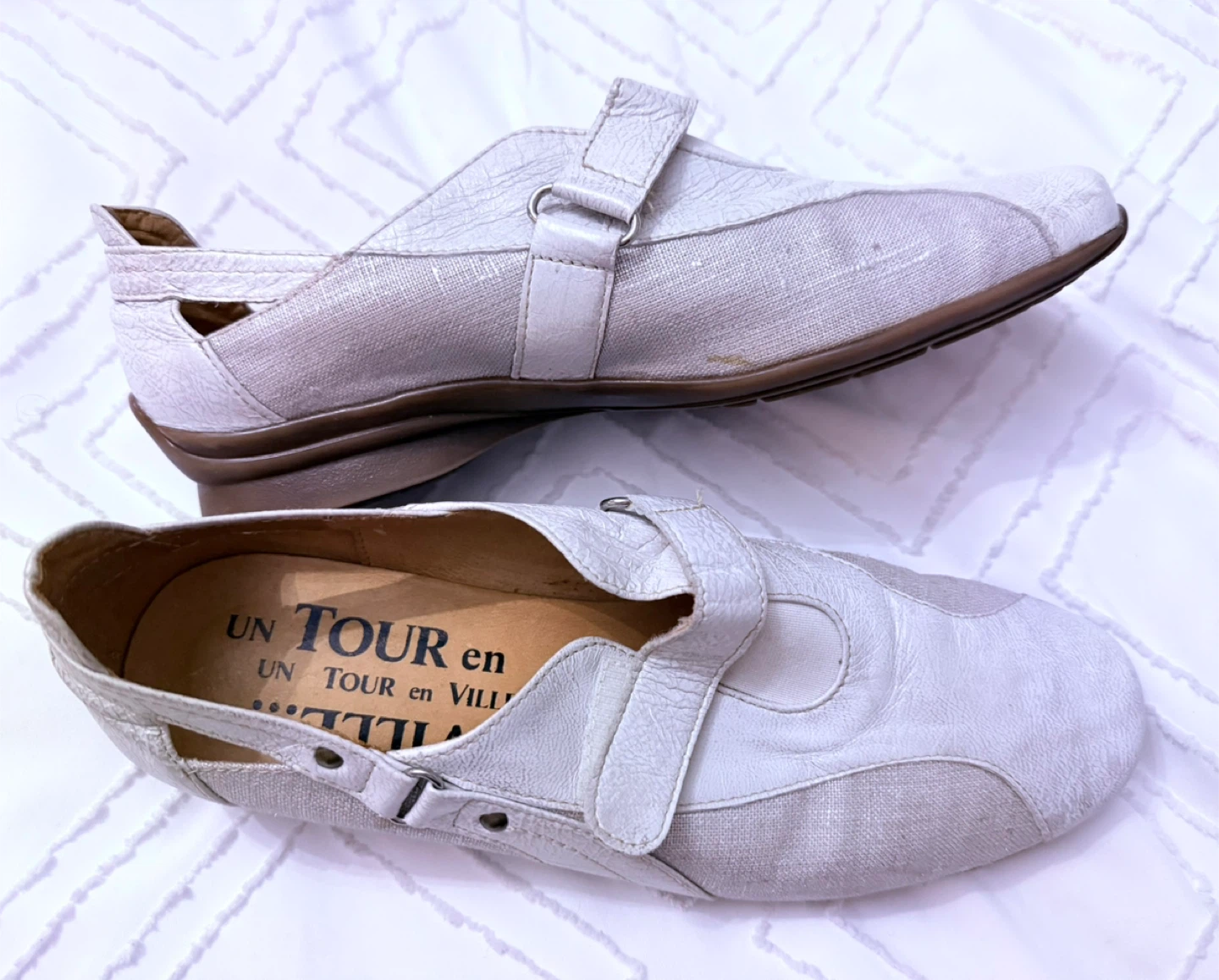 Selling a pair of "Un Tour en Ville" shoes. They are a women's size 39 1/2 and are in good condition. They feature a velcro strap and a unique design. Great for casual wear!