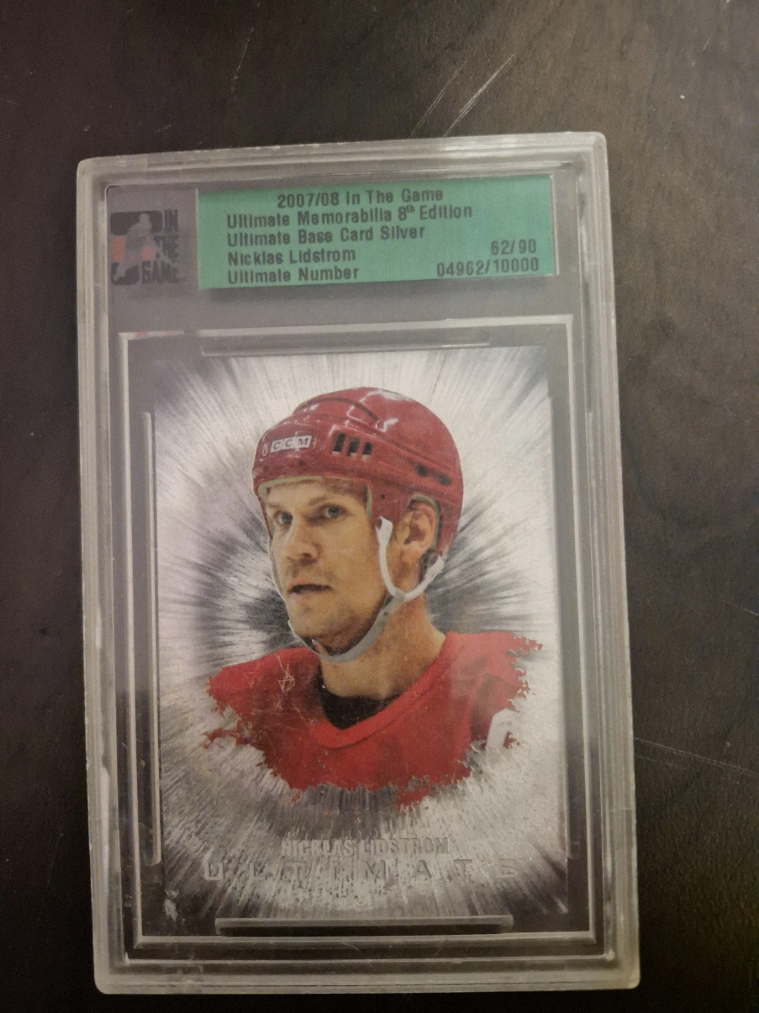 This is a 2007/08 In The Game Ultimate Memorabilia 8th Edition Ultimate Base Card Silver featuring Nicklas Lidstrom. It's part of the Ultimate Number set, with a serial number of 62/90. This card showcases Lidstrom, a dominant defenseman for the Detroit Red Wings and a sure-fire Hall of Famer. It details his career accomplishments, including multiple Stanley Cup rings and a Conn Smythe Trophy.