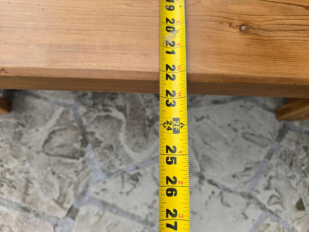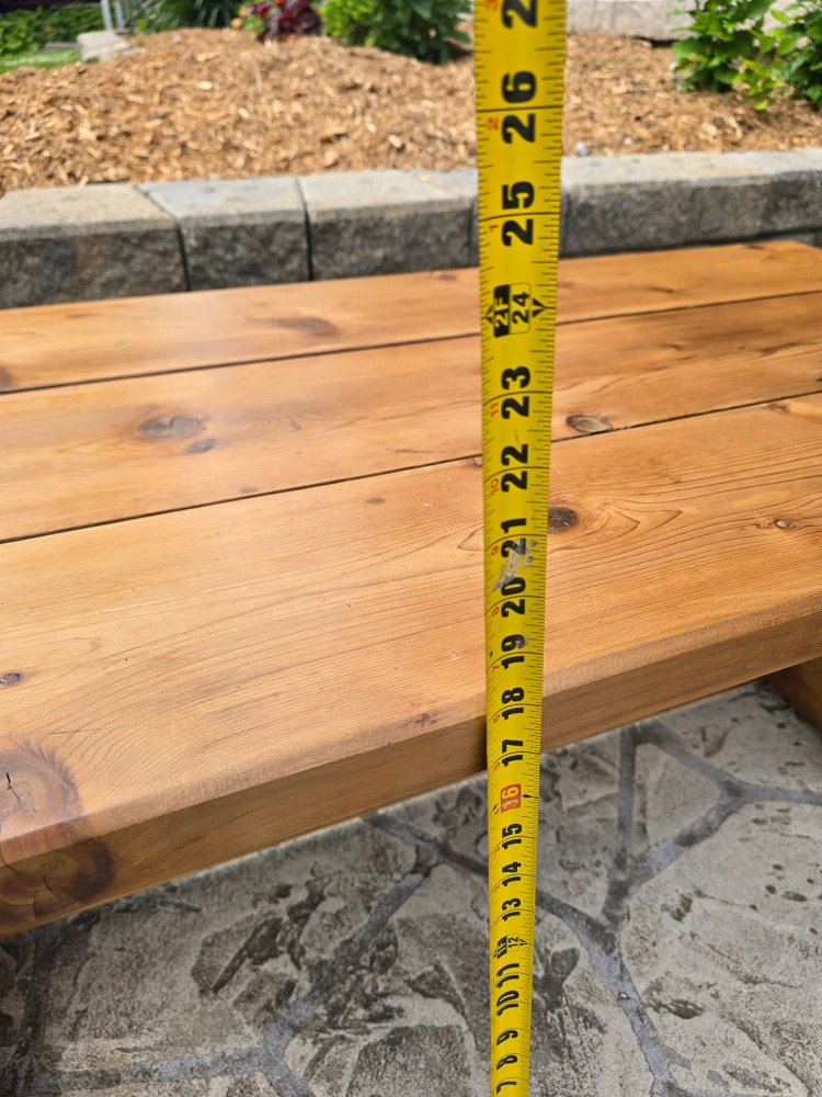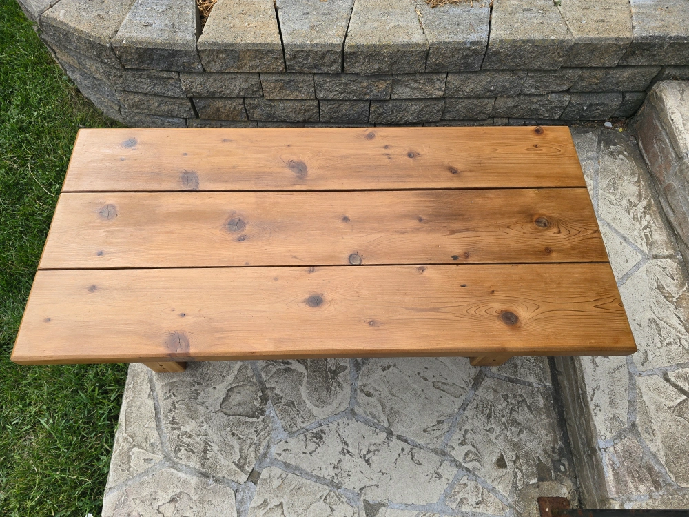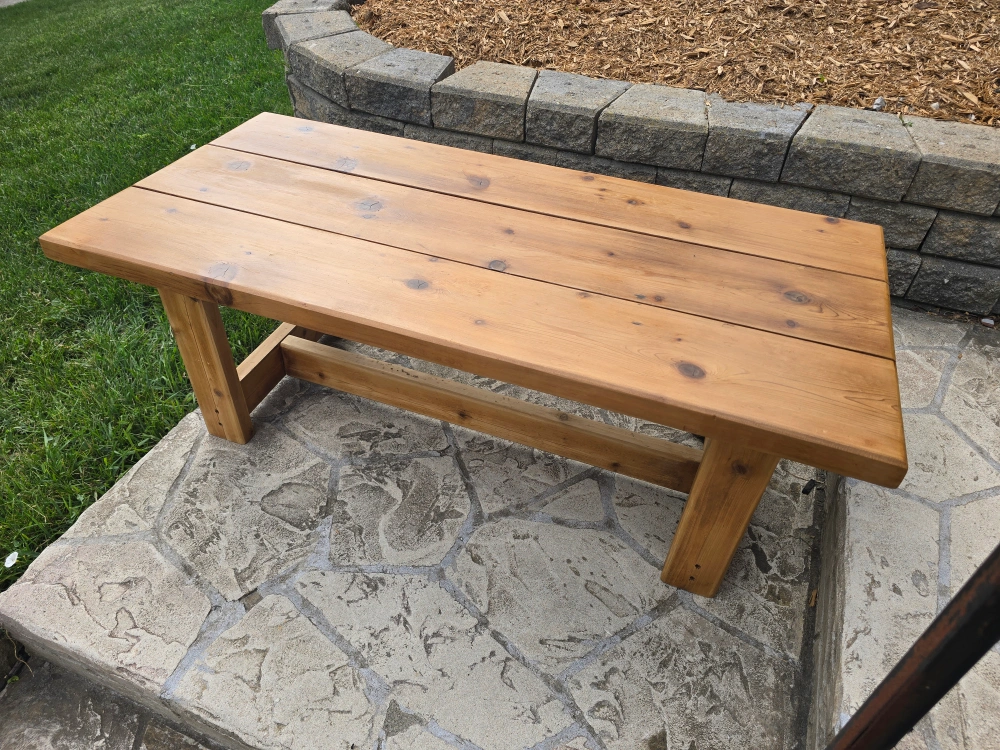 This solid cedar coffee table is perfect for adding a rustic touch to your living space, inside or out. It's sturdy and has a beautiful natural finish. This table has clearly been used, but is ready for your home! Perfect for a coffee table or as a plant stand.