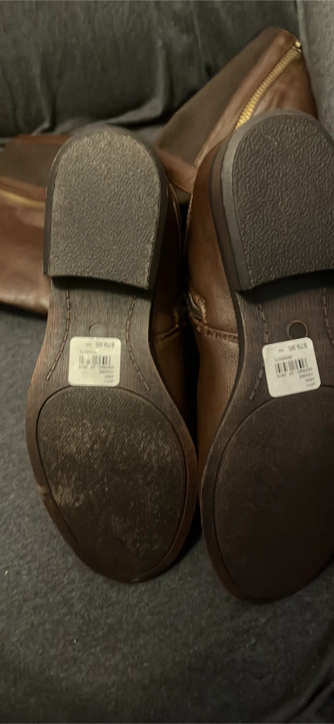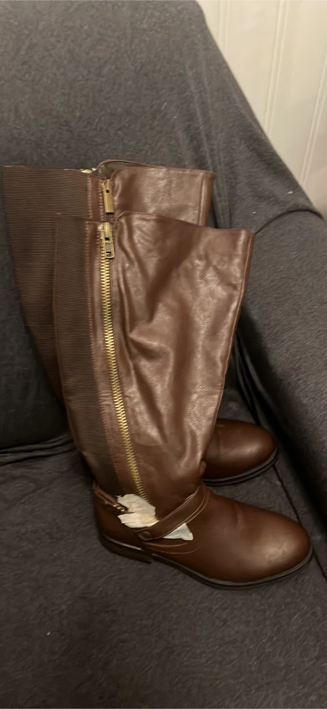 Brown knee-high boots with a side zipper and elastic paneling. Faux leather material. Includes original price tag of $79.95. As ize 7W