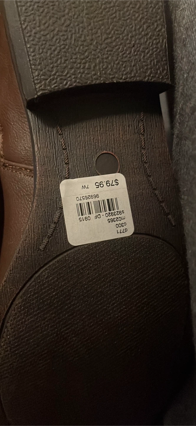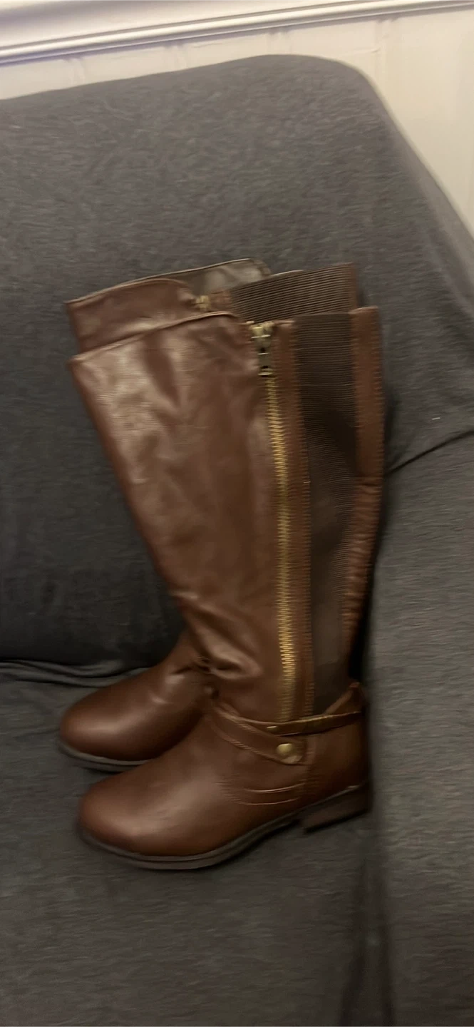Brown knee-high boots with a side zipper and elastic paneling. Faux leather material. Includes original price tag of $79.95. As ize 7W