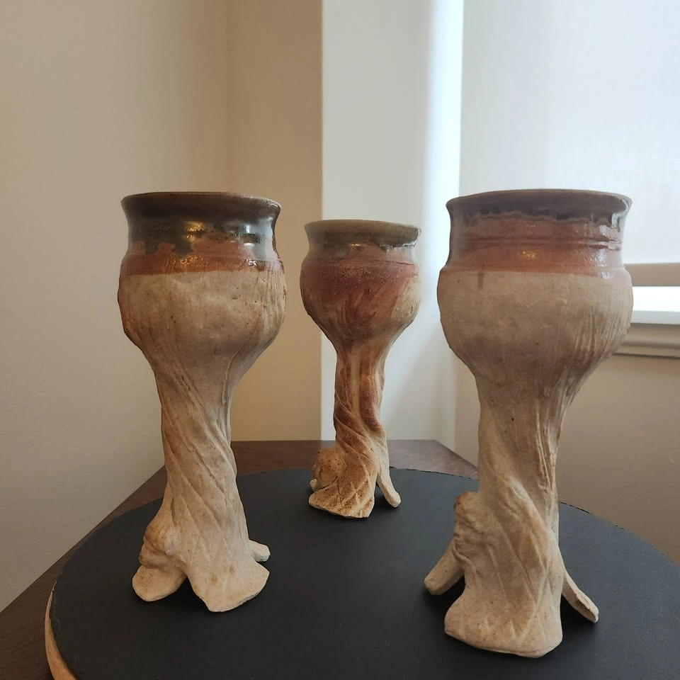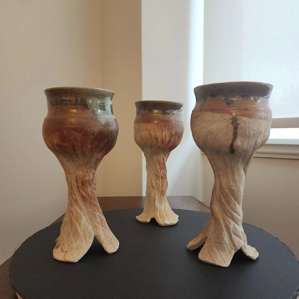 Three hand crafted clay goblets with glazing on the inside.