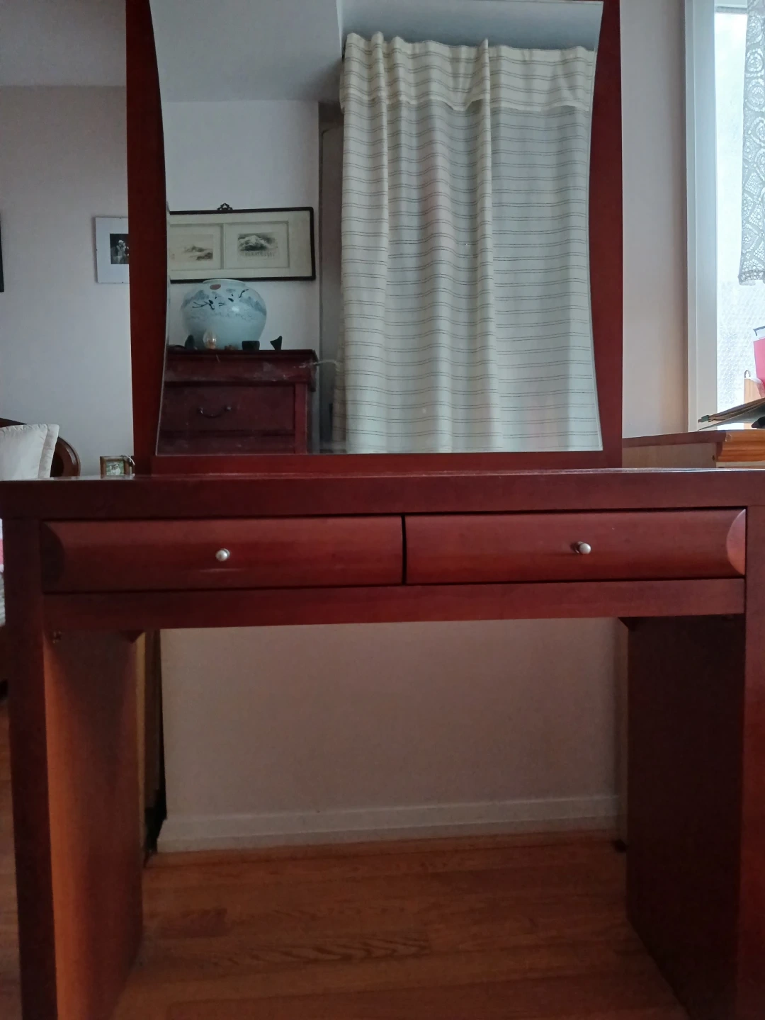 Selling a lovely wooden vanity table with a mirror. It's in good condition and would be a great addition to any bedroom or dressing area. The vanity features drawers for storage and a classic design.