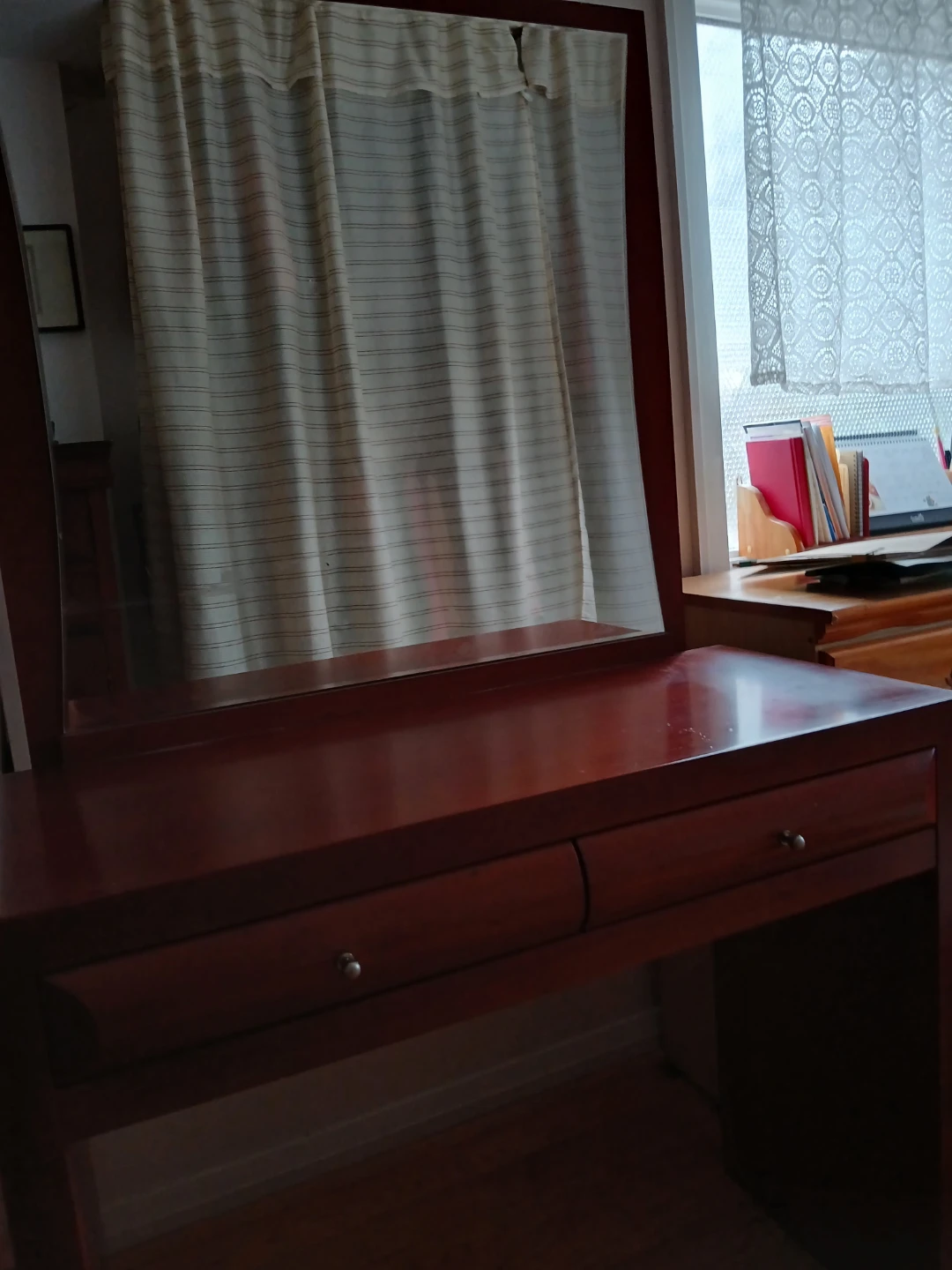Selling a lovely wooden vanity table with a mirror. It's in good condition and would be a great addition to any bedroom or dressing area. The vanity features drawers for storage and a classic design.