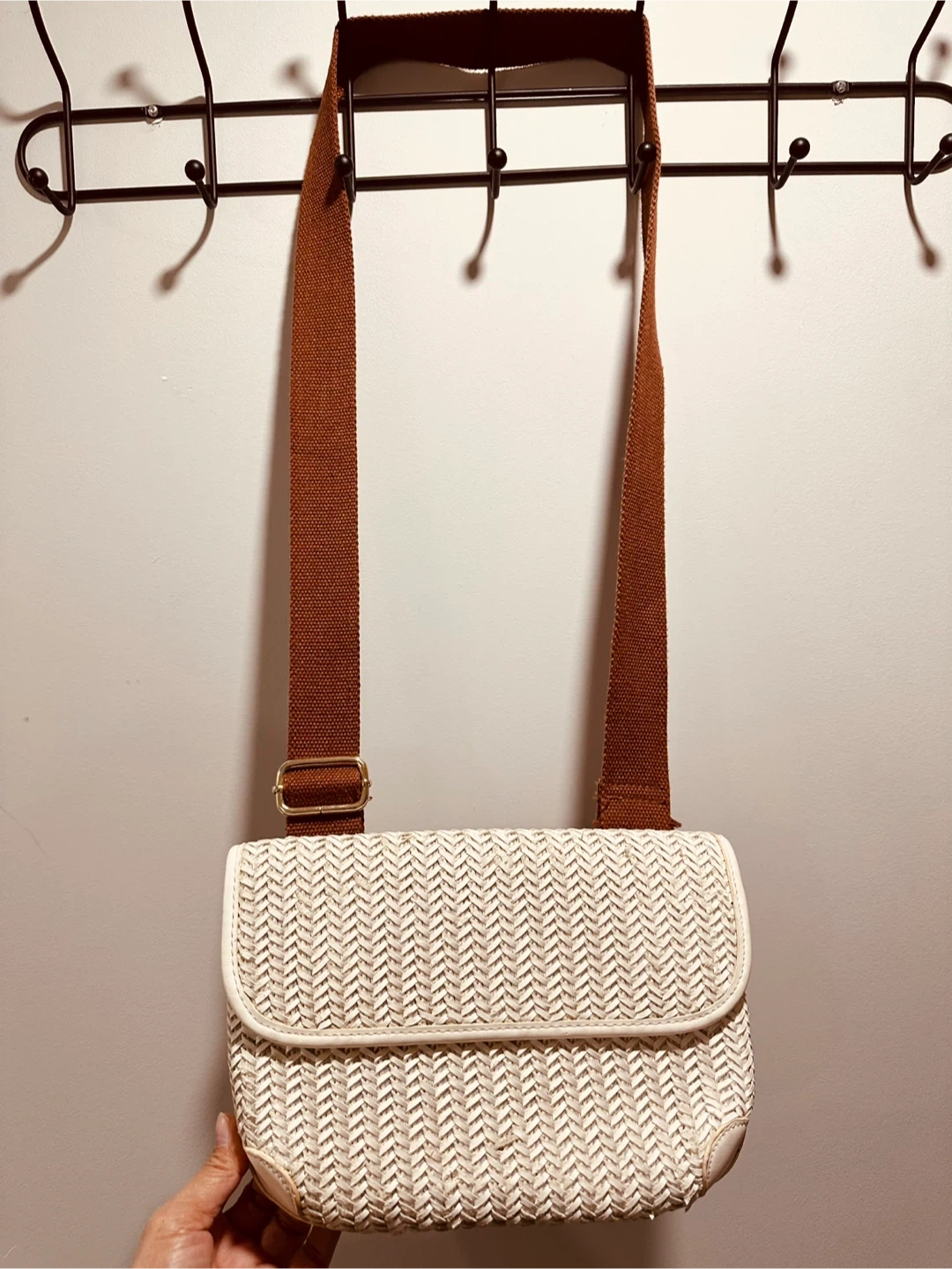 White Woven Crossbody Bag with Brown Strap