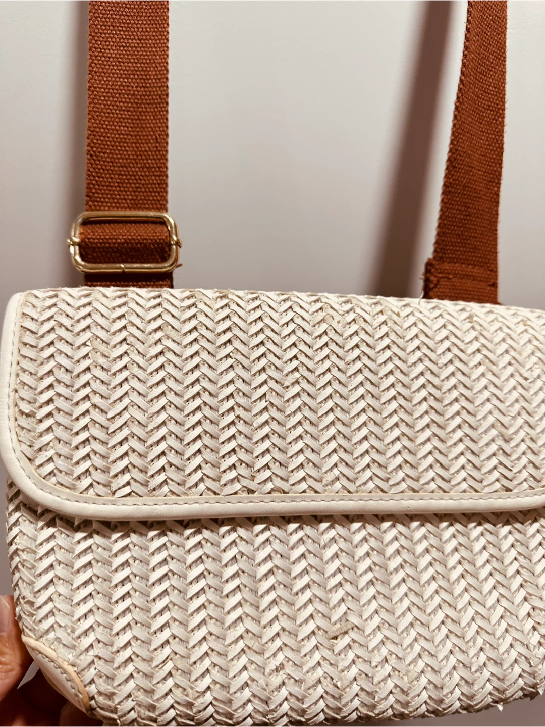 White Woven Crossbody Bag with Brown Strap